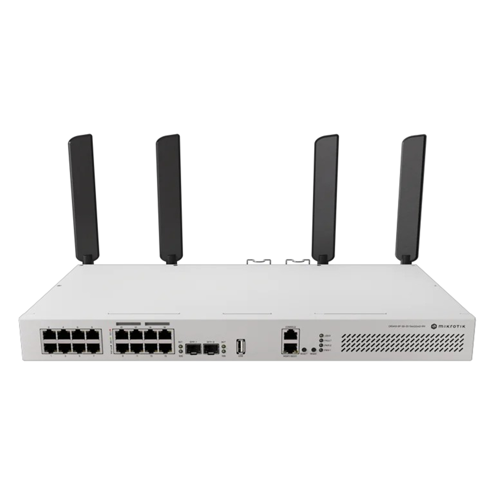 The CRS418-8P-8G-2S+RM combines 16 Gigabit Ethernet ports (eight of them with PoE-out!), two 10G SFP+ cages, USB 3 connectivity. Also, there's a Gigabit management port with a direct CPU line.