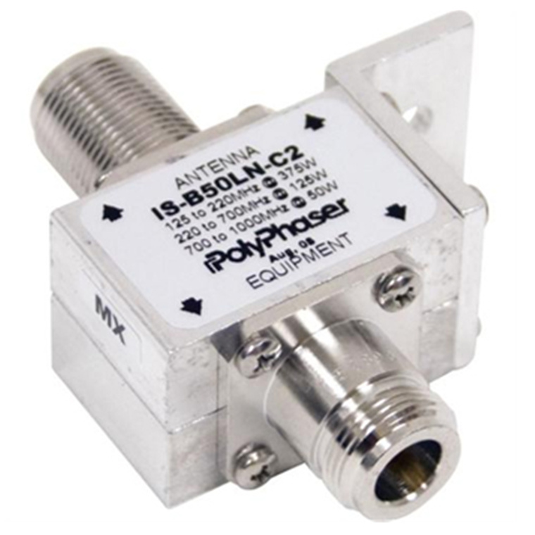 PolyPhaser IS-B50LN-C2 125-1000MHz DC Blocking N Female. The IS-B50 is a dc blocked 50 Ohm bulkhead mounted protector and should be connected directly to a bulkhead or a master ground bar.