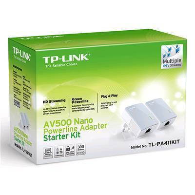 TP-LINK's AV500 Nano Powerline Adapter Starter Kit TL-PA411KIT turns your existing powerline into a high speed network with no need for new wires or drilling. No configuration is required, simply plug your adapters into your power sockets and you can establish networking infrastructure in a flash. With a speed of up to 500Mbps, TL-PA411KIT transmits HD streaming and even 3D movies to every room, making it a great choice for an easy to build multimedia entertainment network.