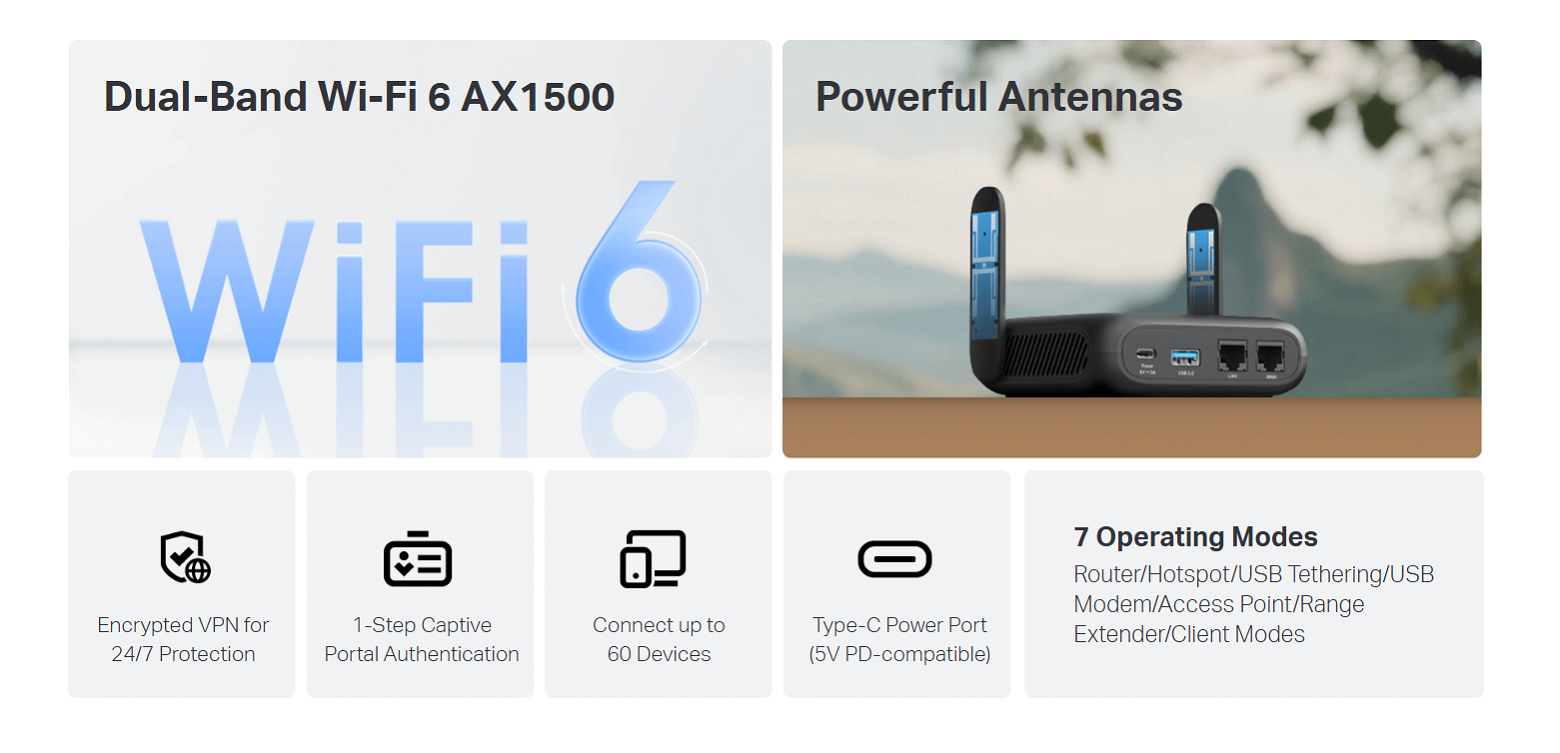 - Flexible Wi-Fi Anywhere, Anytime: With versatile modes including Router, USB Tethering, 3G/4G/5G USB Modem, Hotspot, Access Point, Range Extender, and Client, TL-WR1512X enables flexible Wi-Fi setup for homes, hotel stays, and travel.