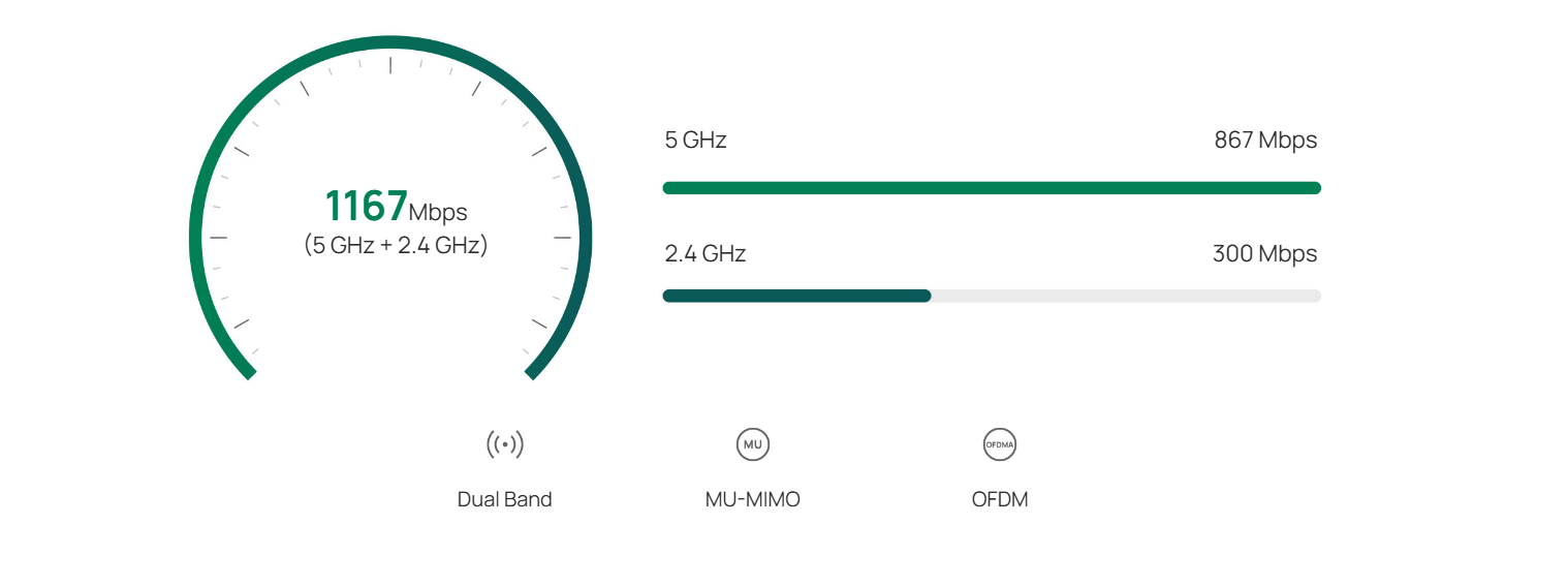 - AC1200 Dual-Band WiFi (867 Mbps on 5 G + 300 Mbps on 2.4 G)[1]