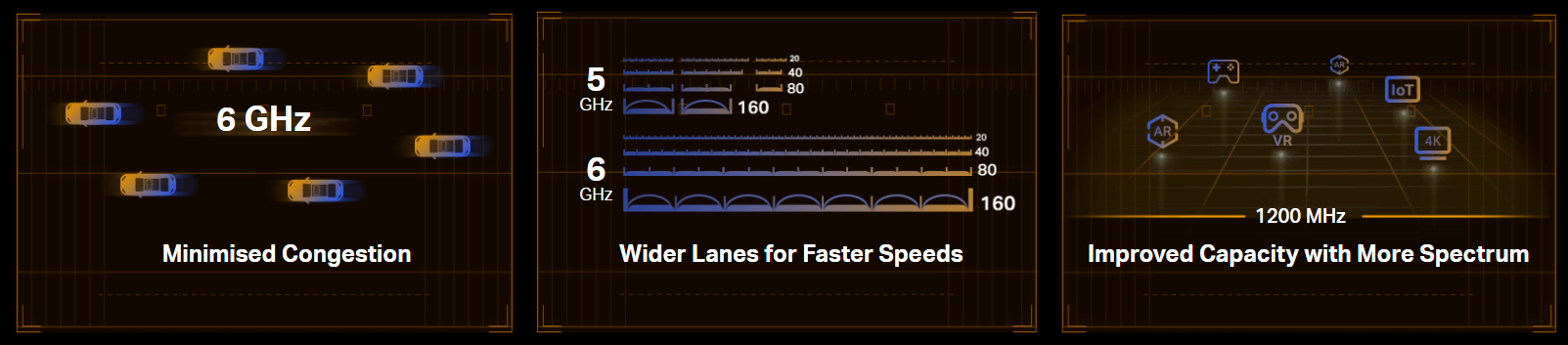 WiFi 6E means WiFi 6 extended to the 6 GHz band, a newly-opened frequency band that adds more bandwidth, faster speeds, and lower latency. This opens up resources for future innovations in AR/VR, 8K streaming, and more.