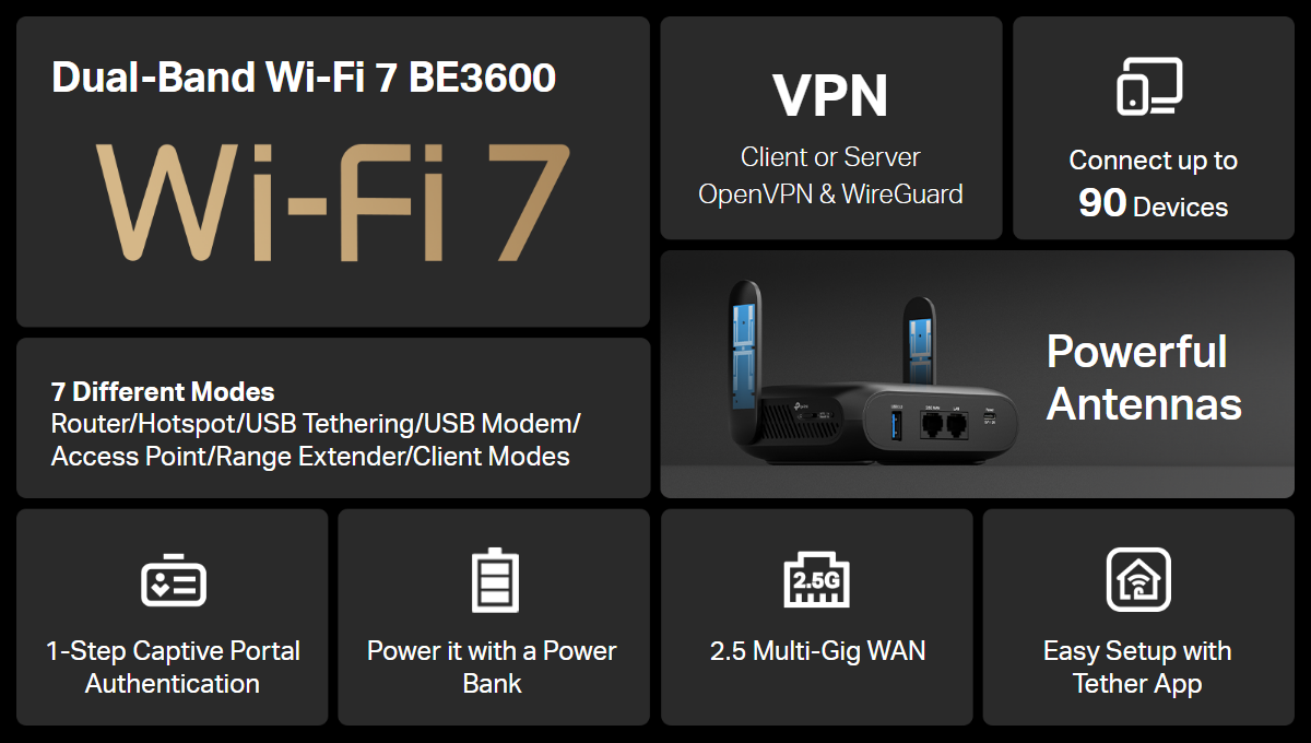 - BE3600 Dual-Band Wi-Fi 7 Portable Travel Router: Merging Wi-Fi 7 Technology, TL-WR3602BE delivers fast wireless speed for uninterrupted video streaming, downloading, and online gaming all at the same time.[1][2]
