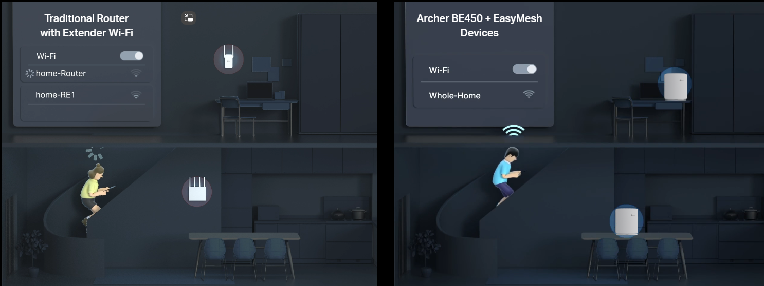 Archer BE450 is EasyMesh-compatible. If you have any dead zones at home, just add another EasyMesh router/range extender to further form your whole home multi-gigabit mesh Wi-Fi. No more searching for a stable connection.