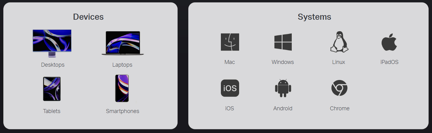 Mac OS, Windows 11/10/8.1/8/7, Linux OS, iPadOS, iOS, Android, and Chrome OS.