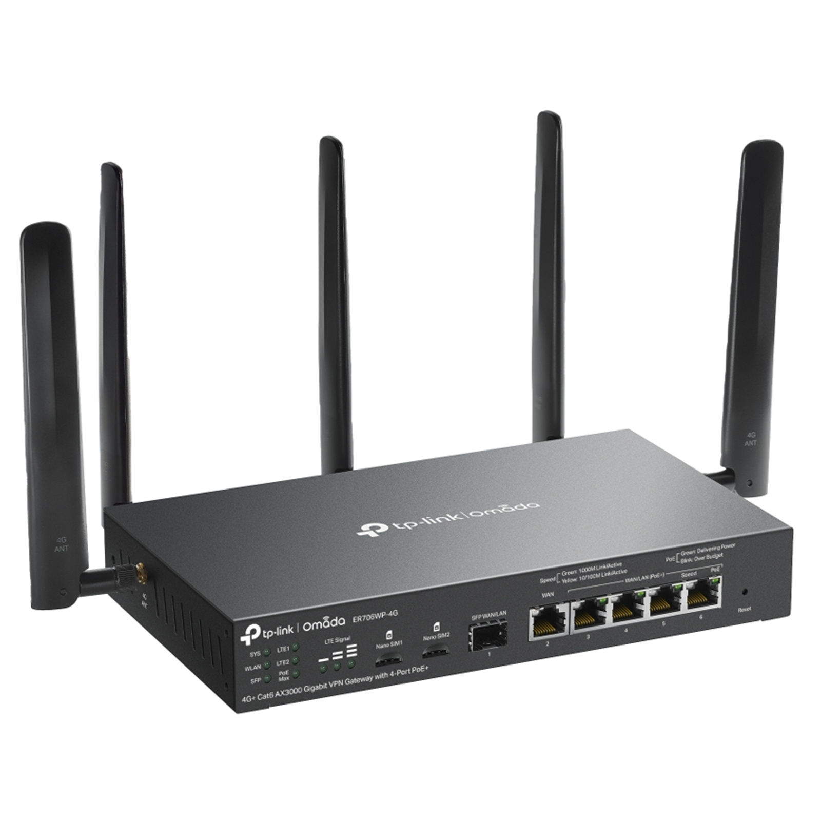 TP-Link Omada ER706WP-4G 4G+ CAT6 Gigabit Multi-WAN PoE VPN Gateway with Dual-Band WiFi 6 AX3000 SFP x1 / 1GbE PoE+ x4 (45W) / Nano-SIM Slot x2