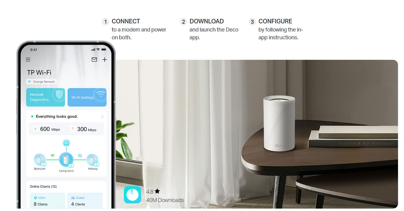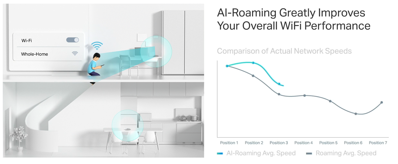 Deco Mesh forms a unified network with a single network name. With built-in AI-Roaming technology, it creates the ideal WiFi solution with its advanced algorithms and self-learning. Walk through your home and enjoy seamless streaming at the fastest possible speeds.*