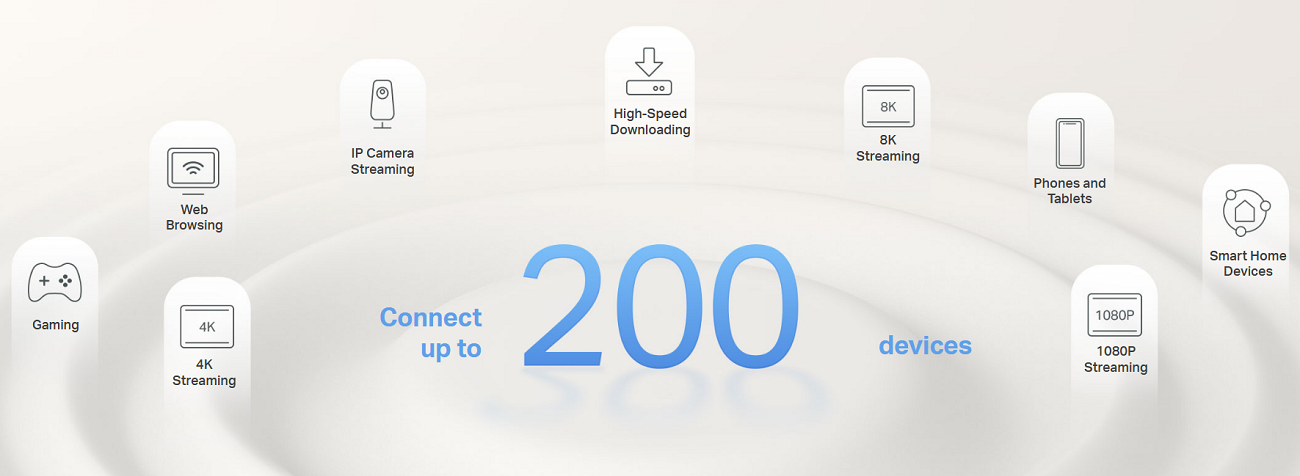 1. Maximum wireless signal rates are the physical rates derived from IEEE Standard 802.11 specifications. Connection to over 200 devices is based on laboratory test data, which analyzed the connections of different devices on the 6 GHz, 5 GHz, and 2.4 GHz bands simultaneously. These devices simulated a typical home scenario by running simultaneous applications in the same room that included 4K video, 1080p video, 720p video, file downloading, web browsing, IP cameras, and other IoT devices. Actual wireless data throughput, wireless coverage, and connected devices are not guaranteed and will vary as a result of internet service provider factors, network conditions, client limitations, and environmental factors, including building materials, obstacles, volume and density of traffic, and client location.