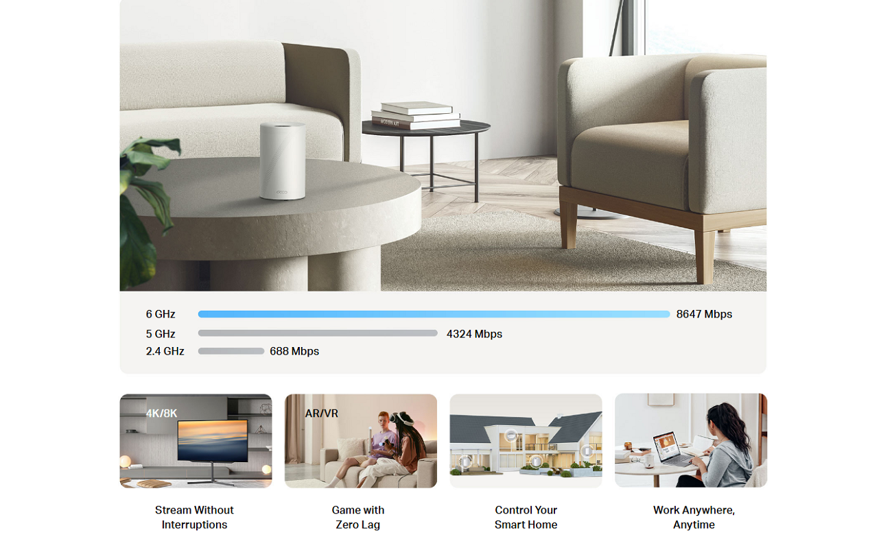 - 8-Stream 14 Gbps Tri-Band WiFi: 8647 Mbps (6 GHz) + 4324 Mbps (5 GHz) + 688 Mbps (2.4 GHz).