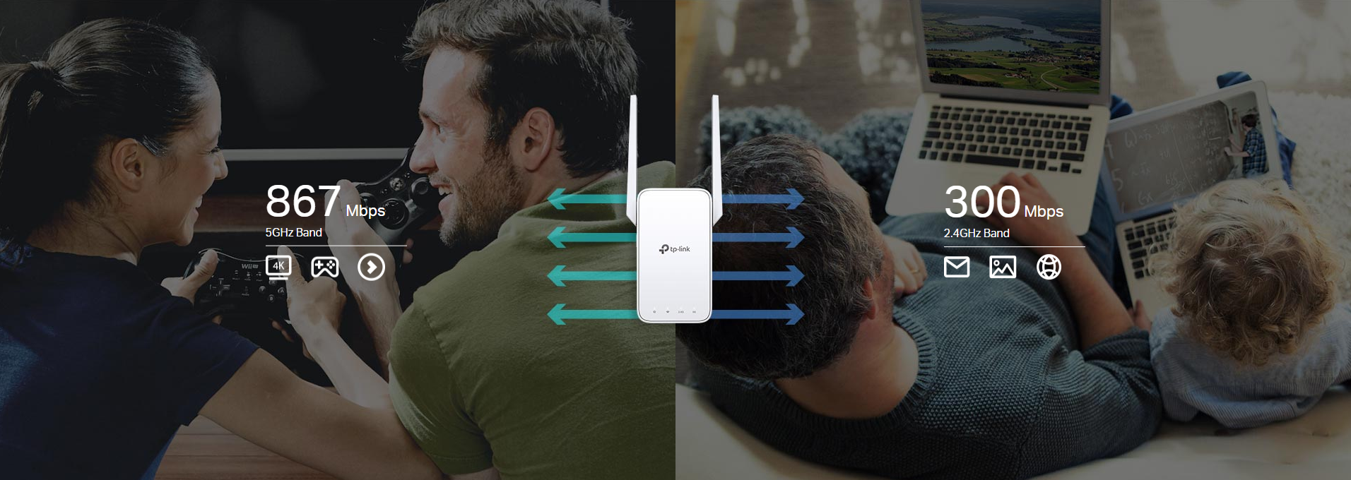 RE315 delivers dual band (2.4 GHz and 5 GHz) to transmit WiFi signals, doubling the performance of each band. It enables you to keep more devices connected at the same time with its 300 Mbps 2.4 GHz and 867 Mbps 5 GHz dual bands. Use the 2.4 GHz band to send email and browse the web and the 5 GHz band for gaming and HD streaming.†