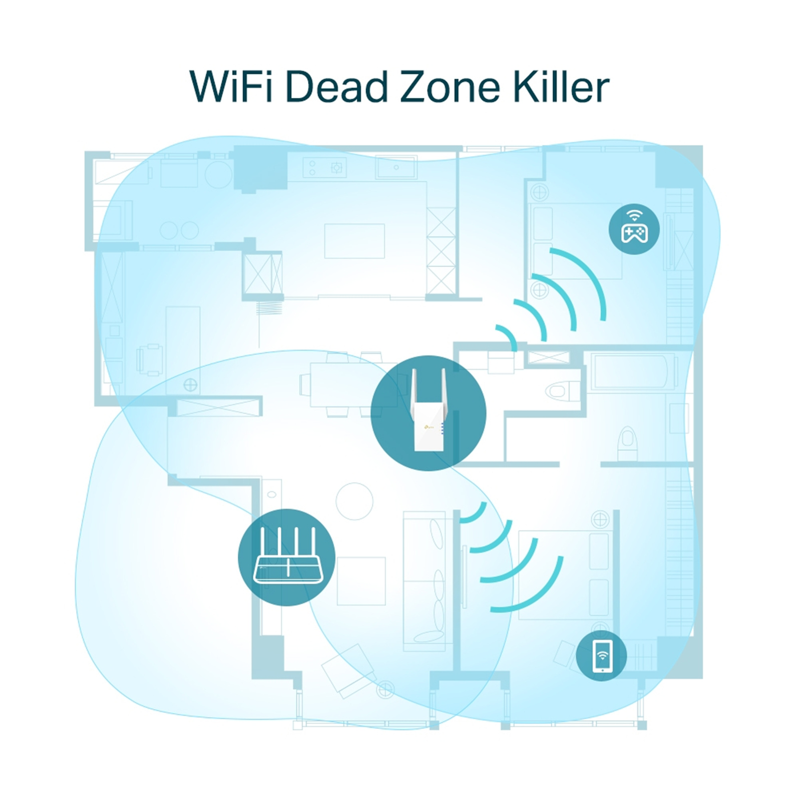A single router has limited WiFi coverage and always causes WiFi dead zones. RE605X wirelessly connects to your existing router and boosts more WiFi signals throughout your home, allowing you to enjoy smooth WiFi 6 network experiences everywhere with great speed, capacity, and coverage.