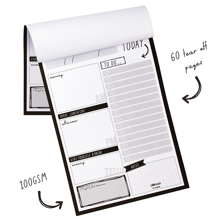 Boost your productivity with the Carpe Diem Daily Planner Pad in sleek black. This premium planner features 60 sheets of high-quality 100gsm paper, providing a luxurious writing experience for your to-do lists, errands, and important events. Its timeless black color adds sophistication, making it ideal for professionals, students, or anyone looking to enhance their time management.