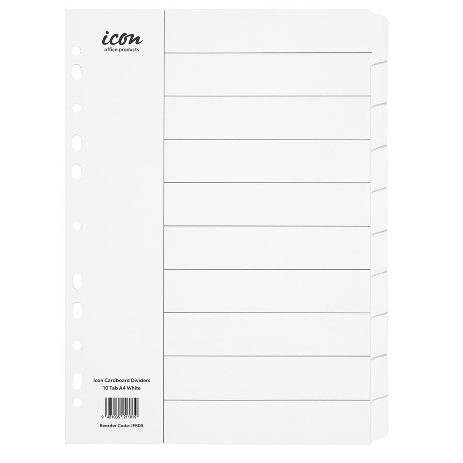 Product URL: https://www.pbtech.co.nz/product/OFSICN5211819/Icon-IF605-Cardboard-Dividers-10-Tab-White