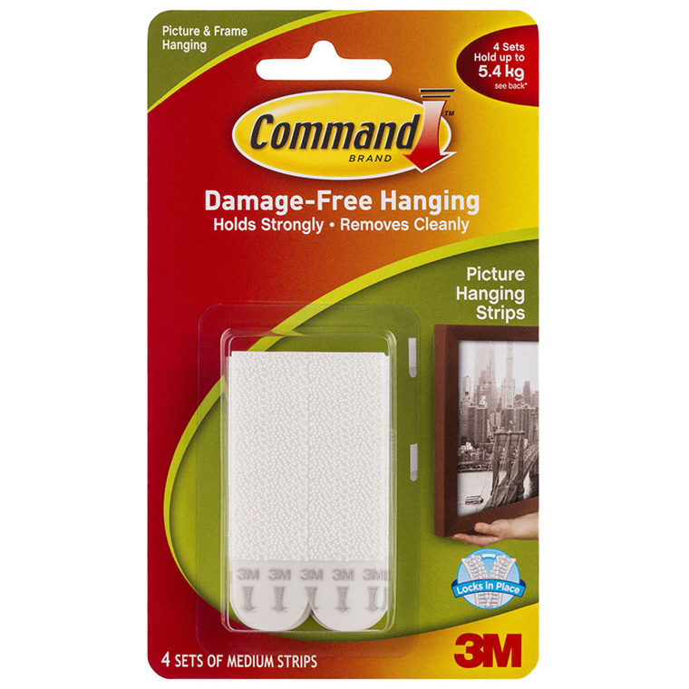 Forget about nails, screws and tacks, Command Picture Hanging Strips are fast and easy to hang - no more holes to worry about! Strips 'snap' and lock together, providing a secure strong hold. Using the revolutionary Command Adhesive, they hold strongly on a variety of surfaces, including painted walls, wood, tile and more. Yet, removes cleanly - no holes, marks, sticky residue or stains. Each pack contains 4 sets of medium white strips. 4 medium strips hold up to 5.4kg. Ideal for frames no bigger than 46cm x 61cm in size.