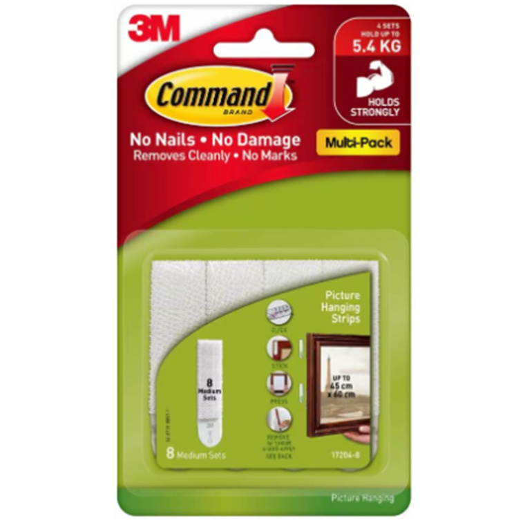 Command™ Damage-Free Picture Hanging, Holds Strongly, Removes Cleanly, No Nail Holes. 4 sets of strips hold up to 5.4kg. Contains 8 sets of strips.