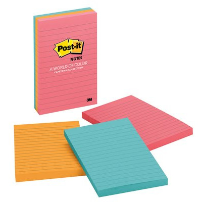 Post-it® Notes in 98 mm x 149 mm size offer enough room to catch the important details. A World of Colour Cape Town Collection portrays a vibrant palette that s true to this port at the Southern tip of Africa. Lined notes keep your thoughts straight. 3 Pads/Pack.