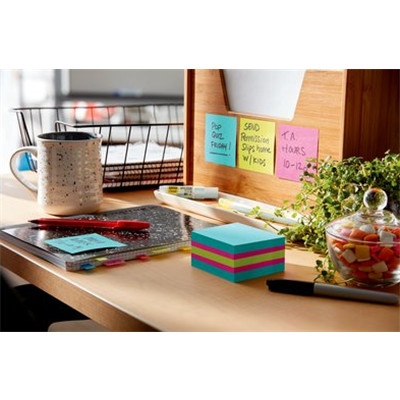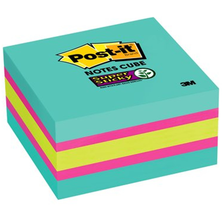 Post-it® Super Sticky Notes have 2X the sticking power so your message can stay front and center. In a fun cube format featuring 360 sheets, you can always have a note close by for quick memos and reminders. Bright blue, pink and green colors ensure your note stands out. Unique adhesive technology allows you to stick and restick so reminders can go with you. Great for vertical surfaces like walls, doors and more. 360 Sheets/Cube, 1 Cube/Pack.