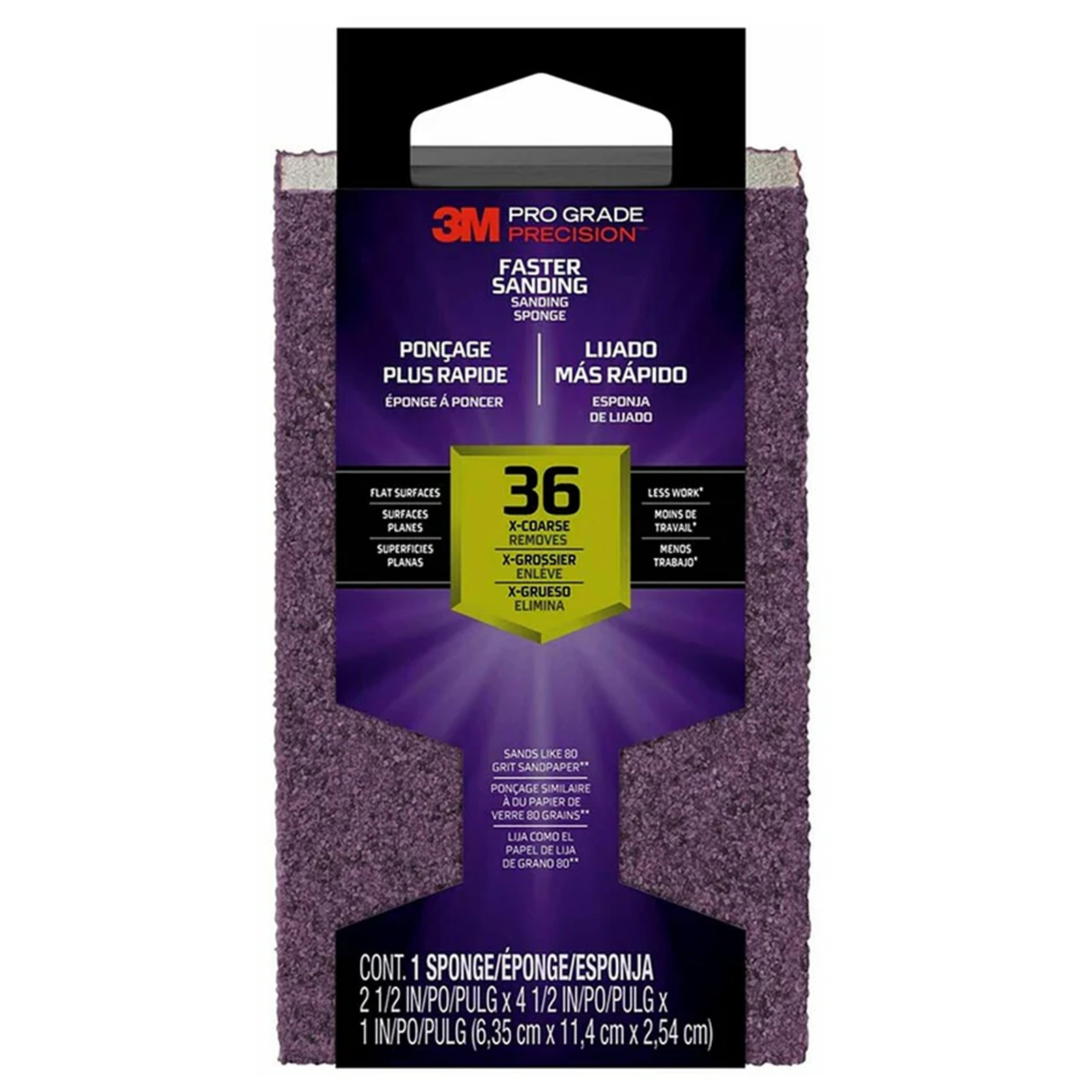 Comfortable and powerful, the Pro Grade Precision Faster Sanding Block Sponge delivers an excellent sanding experience in the palm of your hand. This durable sponge helps you complete the job quickly with premium grits, and its pliable design allows access to hard-to-reach places. A unique coating resists clogging for extended use, and the sponge is suitable for both wet and dry sanding. When finished, simply rinse and reuse. Achieve professional results with the Pro Grade Precision Faster Sanding Block Sponge.