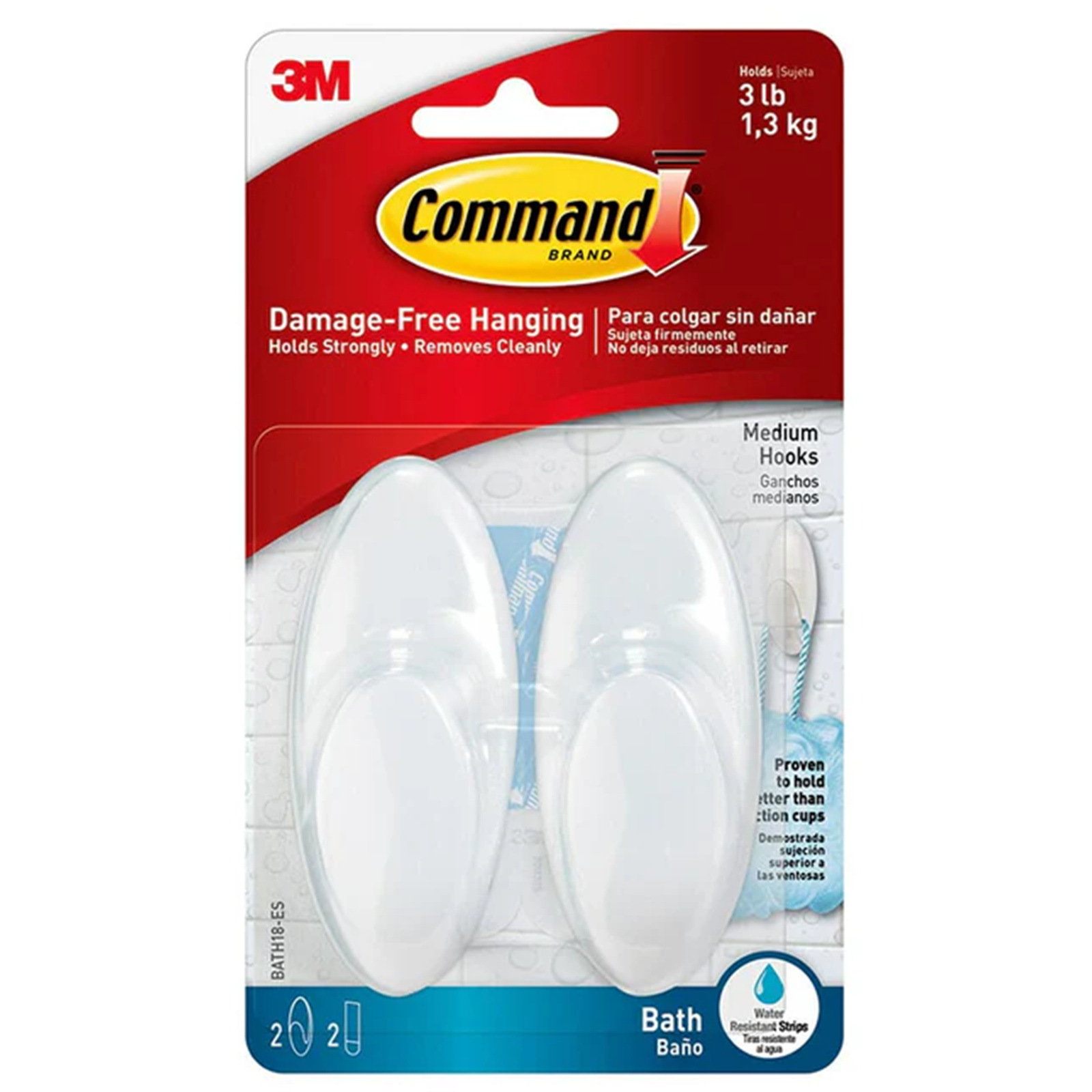 Command Medium frosted towel hooks allow you to keep your bathroom organized both inside and outside of the shower. The hook stands up to hot, wet and humid environments and sticks to a variety of surfaces, including glass, mirror, tile, fibreglass, wood and painted surfaces. Tested and proven to hold better than suction cups, it is easy to apply and comes off cleanly without damage. Repositioning is easy with assorted water resistant refill strips. Great for bathroom organisation including guest and kids' bathrooms and rental properties!