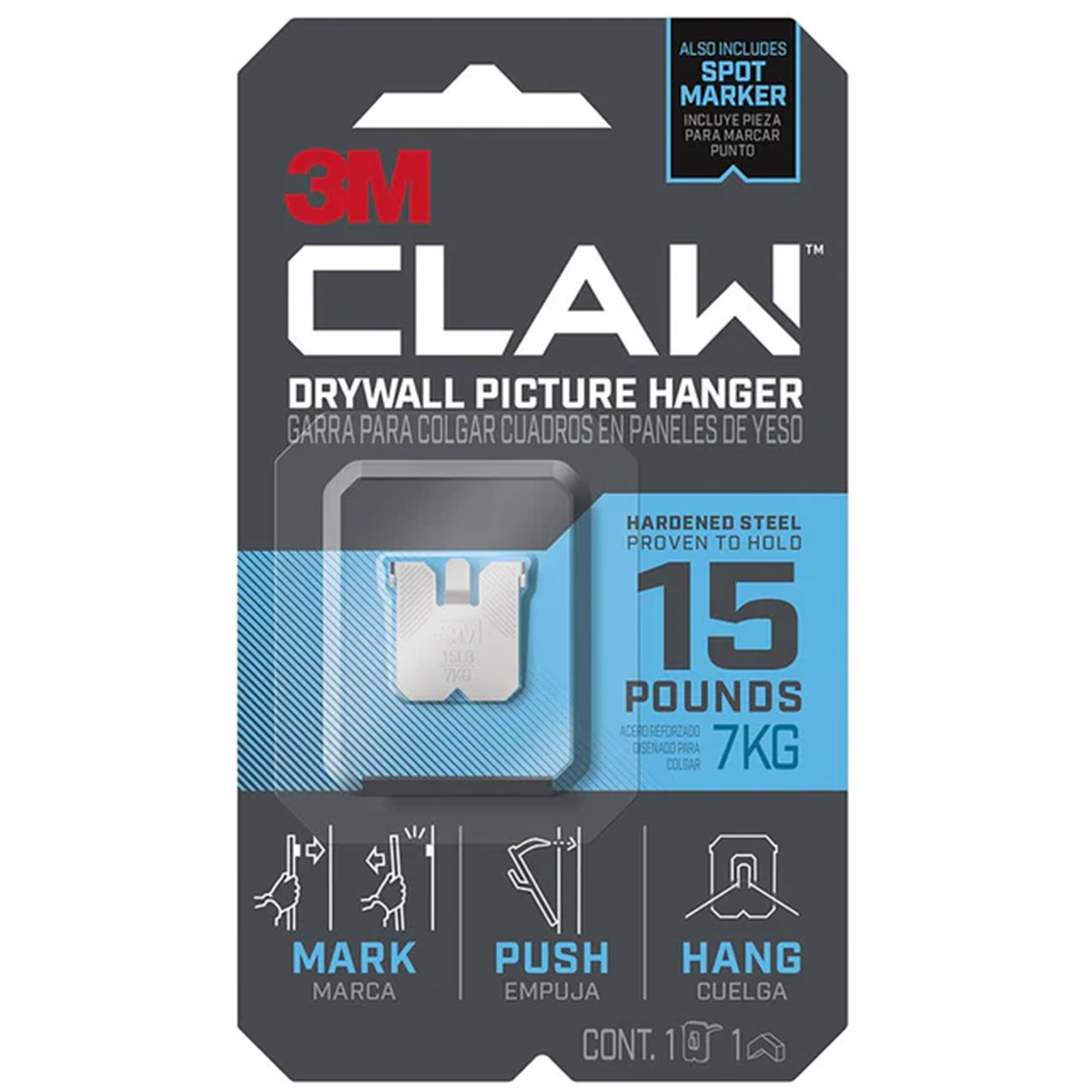 Introducing the new 3M CLAW Plasterboard Picture Hanger, proven to hold up to 7 kgs. Designed for heavyweight mirrors, frames, and home decor. The engineered 304 hardened steel claws lock securely into plasterboard anywhere - just push, hang and you're done. 1 dry wall picture hanger and 1 spot marker.