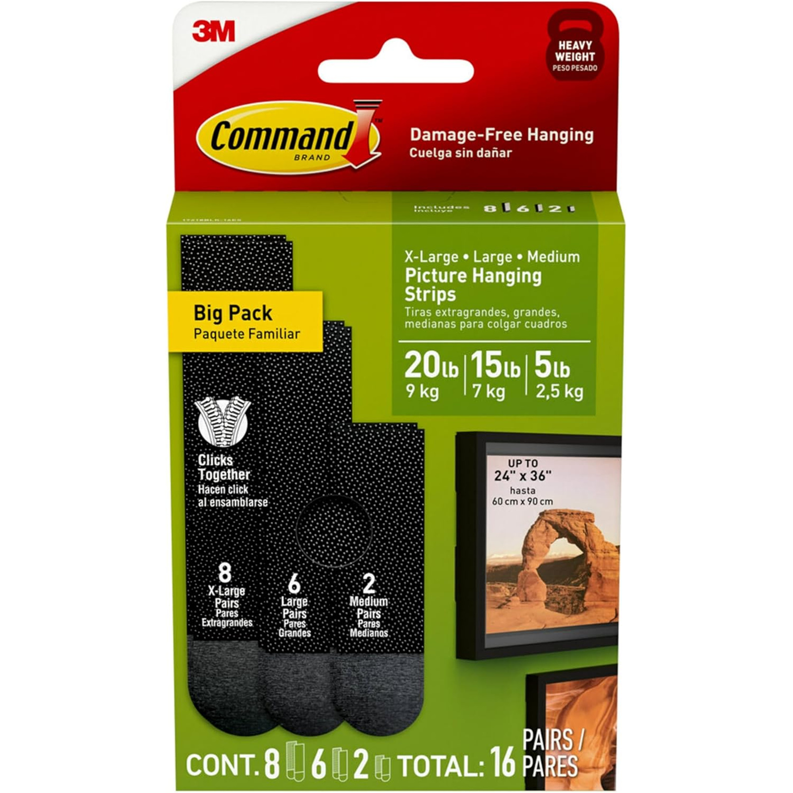Forget about nails, screws and tacks, Command Picture Hanging Strips are fast and easy to hang - no more holes to worry about! Strips 'snap' and lock together, providing a secure strong hold. Using the revolutionary Command Adhesive, they hold strongly on a variety of surfaces, including painted walls, wood, tile and more. Yet, removes cleanly - no holes, marks, sticky residue or stains. Each pack contains 2 medium pairs (4 strips total), 6 large pairs (12 strips total), and 8 extra-large pairs (16 strips total).