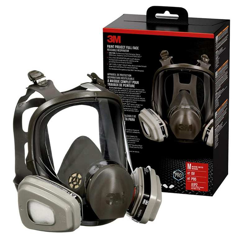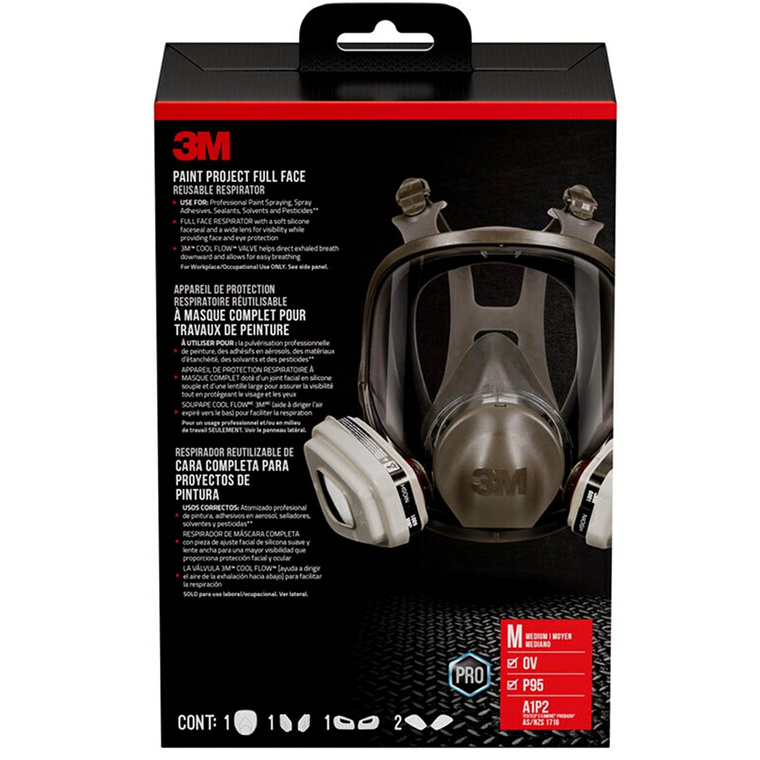 The 3M Full Face Paint Project Respirator 68P71 helps provide protection against certain paint spray, solvents and vapors. This reusable respirator is designed for professionals. The balanced, four-strap design provides lasting comfort with full face and eye protection. 1 respirator per pack.