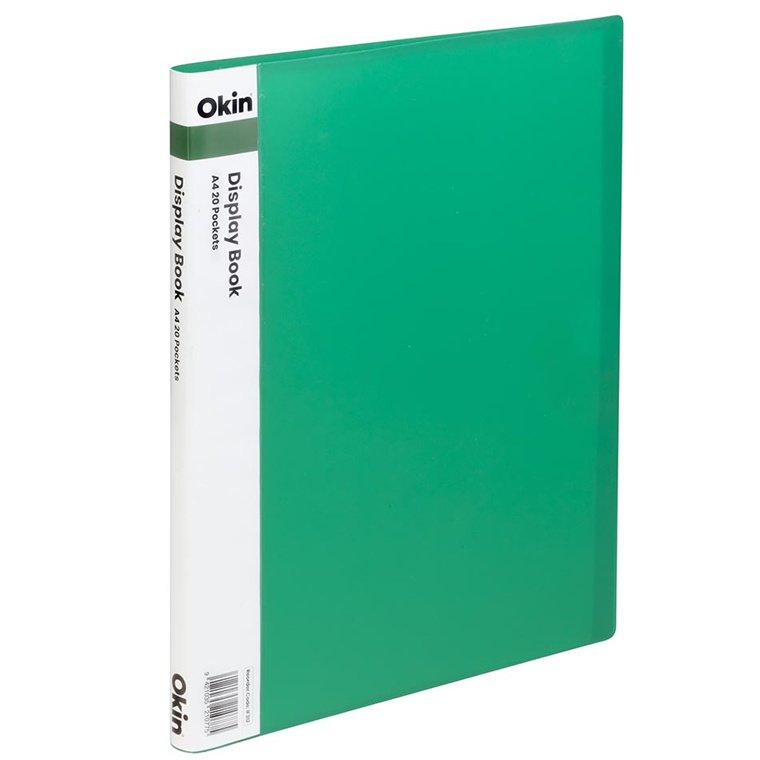 Okin Display Books are an ideal way to hold and display your A4 documents. Clear plastic polypropylene pages keep your paper and documents securely protected. Pockets are securely bound into the the spine of the durable polypropylene cover. Insert spine allows you to personalise your display book. A4 size. 20 pockets. 40 page capacity. Green color.