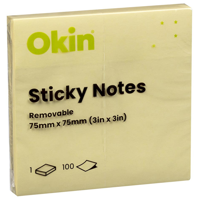 Okin Sticky Notes can be adhered to almost any horizontal surface. Ideal for paper to paper applications. 75mm x 75mm (3 x 3in). 100 sheets per pad. Yellow.