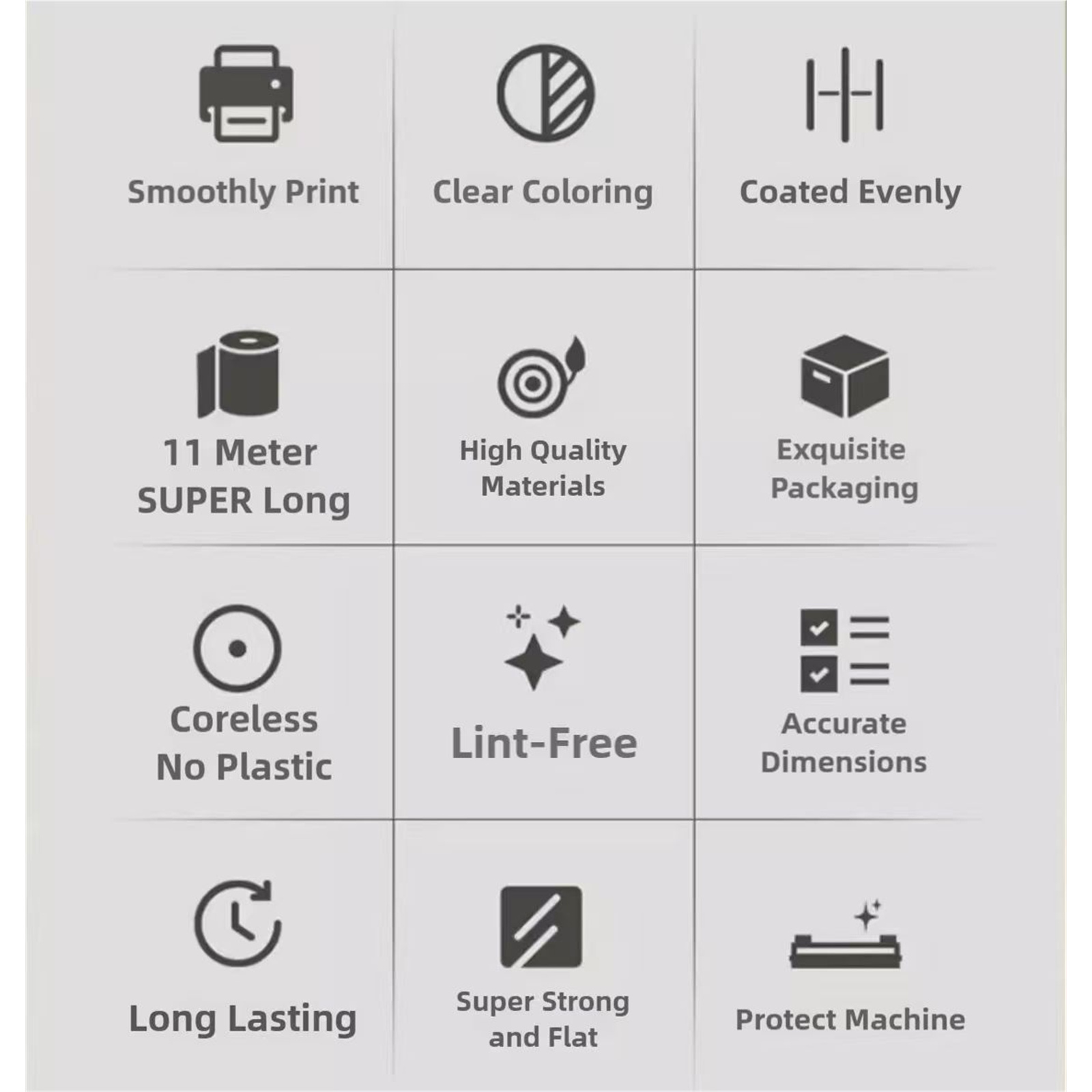 57 mm (Width) 38 mm (Diameter), 11 Meter Length, 50 Rolls Per Box, No Plastic Core