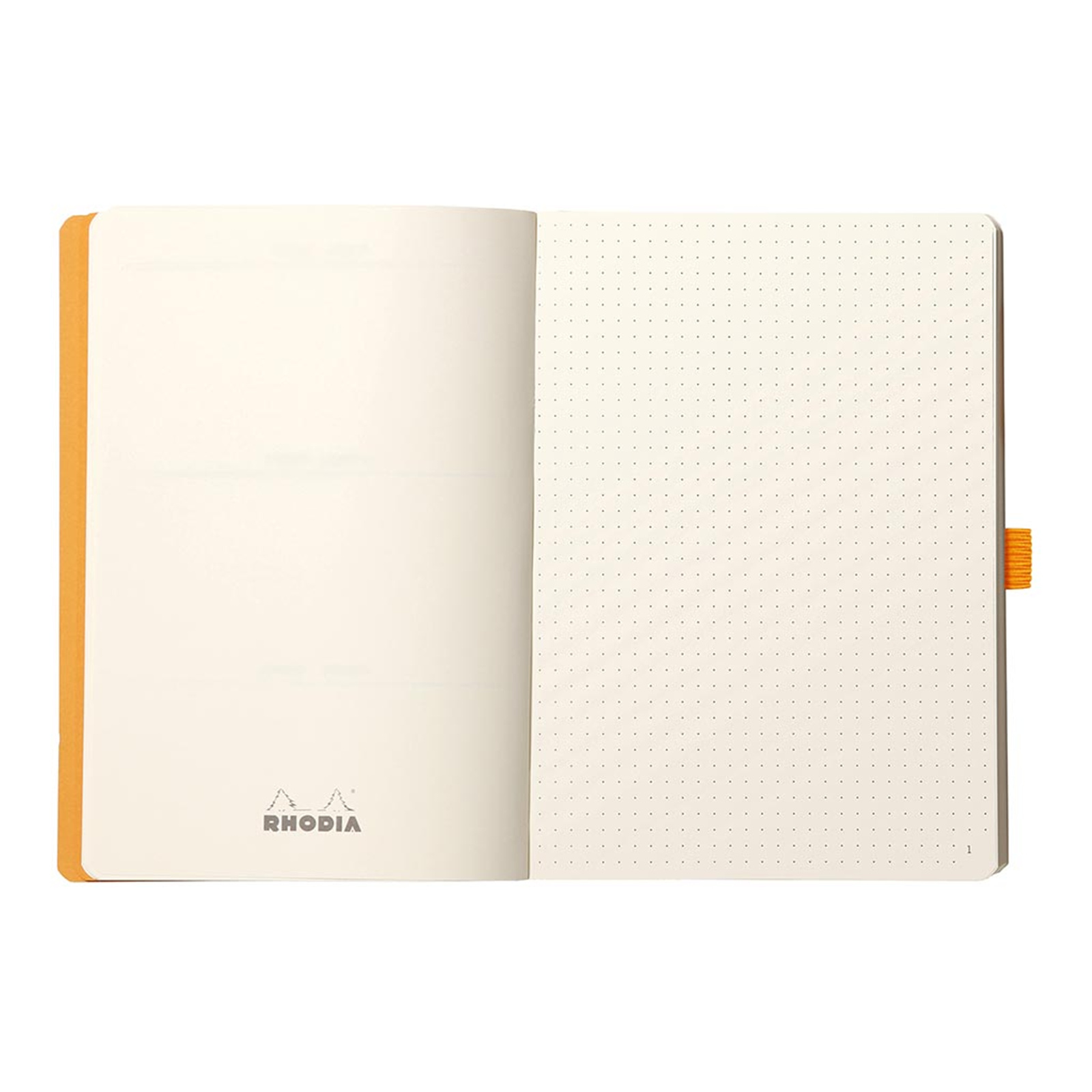 The Goalbook is perfect to organise your days and make sure you don't forget anything. It has numbered note pages, contents tables, indexing and perpetual calendars so you can customise as you please, and design and manage your own organisation system. Jot down your lists using short, abbreviated sentences. Be even more efficient and tag them using customised symbols. As and when required, these lists of note, tasks and events can then be updated, corrected or even put on hold. Rhodiarama Goalbook notebooks feature the Rhodia logo embossed on the cover with a bright orange elastic closure, ribbon bookmark and pocket on the inside back cover, 6 page index and perpetual calendar. The paper is Clairefontaine's 90gsm bleed-proof so you can be assured of using both sides of every sheet. The lovely smooth paper is a pleasure to write on with a fountain pen. PEFC-certified from sustainable forestry. Made in France by Clairefontaine.