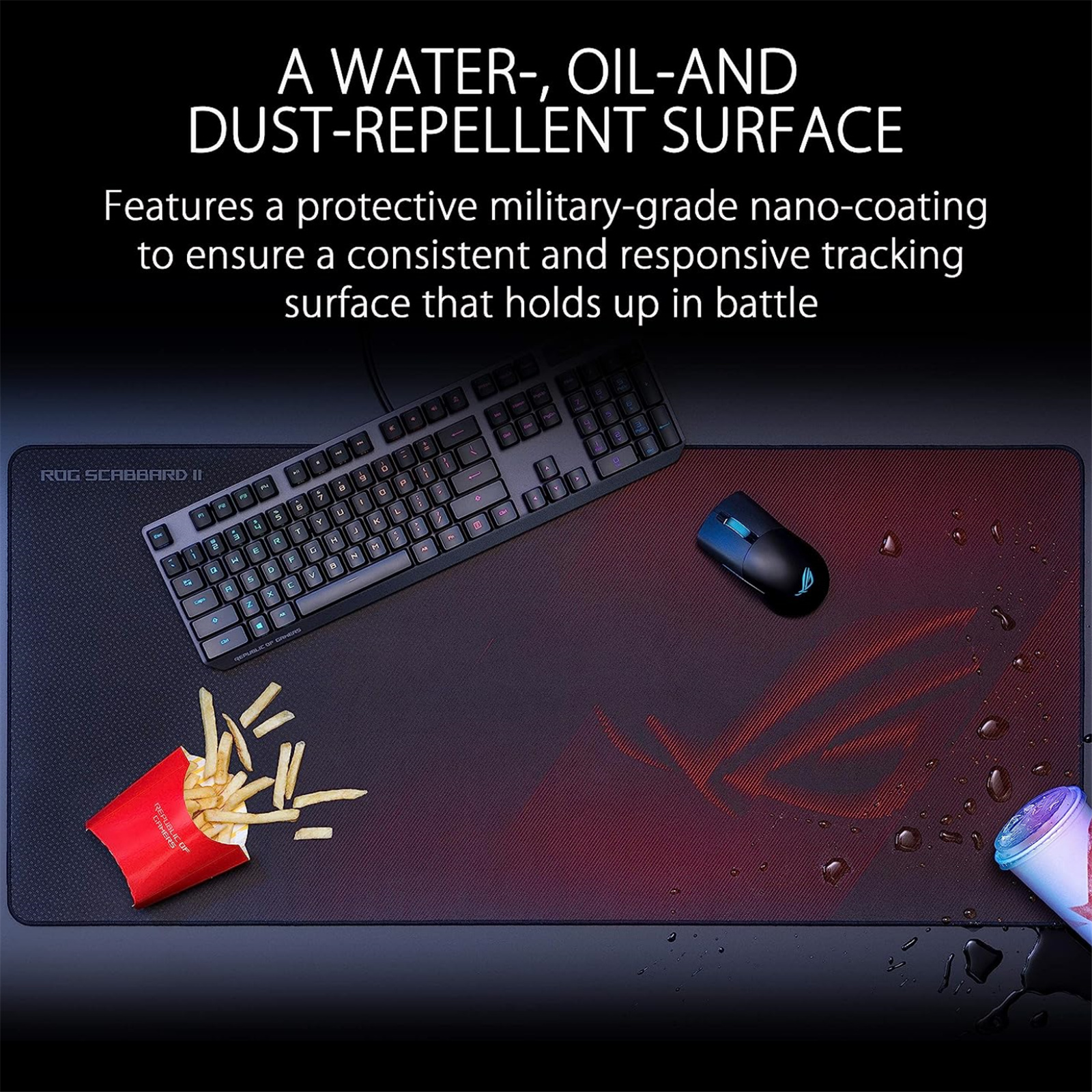 ROG Scabbard II is made of durable woven fabric with industry-leading American Association of Textile Chemists and Colorists (AATCC) Grade 100 water and Grade 2.5 oil resistance, so it's protected against accidental spills and easy to clean and maintain. It features a protective military-grade nano-coating* to ensure a consistent and responsive tracking surface that holds up in battle.