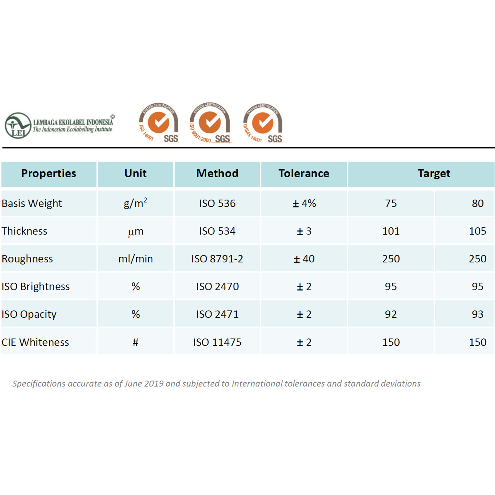 PCC pigment technology improves smoothness, thickness and opacity while reducing wood-fiber usage. The paper is alkaline sized to meet ISO 9706 for archival quality. This copy paper is produced at APRIL's Riaupaper mill in Sumatra, which is ISO9001 and OHSAS18001 certified.