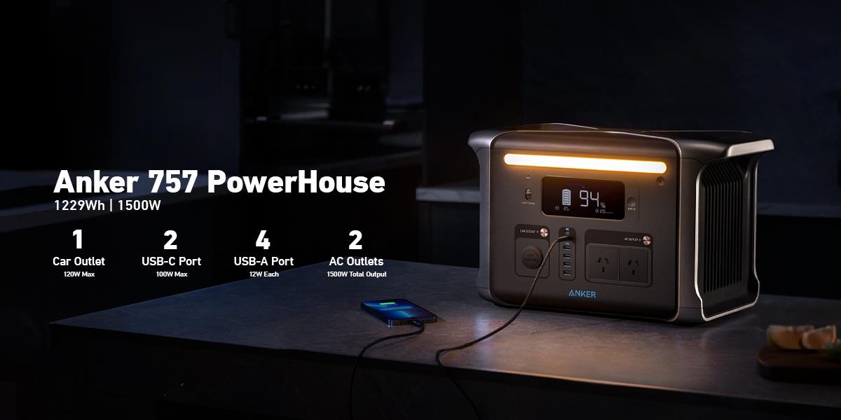ANKER PowerHouse 1229 Wh AC Output 1500W, Surge (2400w) 2* AC Ports, 2* USB-C 100w Ports 4* USB-A 12w Each ports & 1* car outlet 120w PowerStation