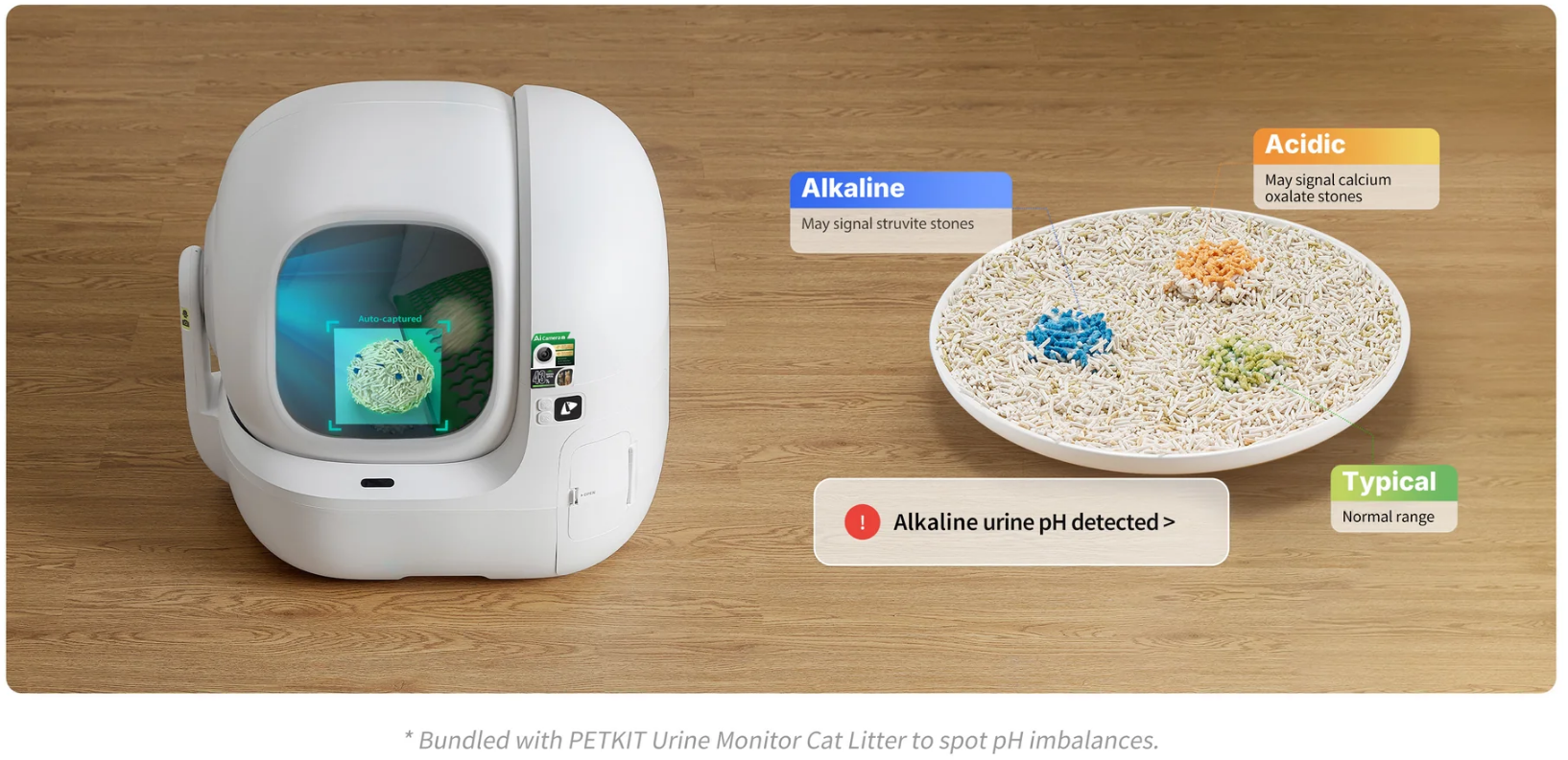 Each visit is captured by the AI camera, analyzing clumps to track urine pH. Instant app updates help spot potential urinary issues early, keeping cats healthy and giving owners peace of mind.