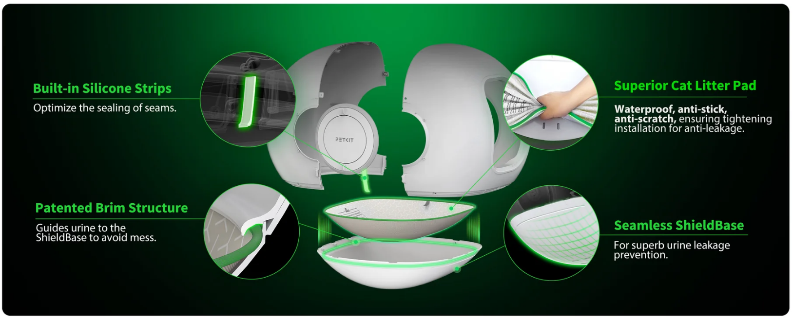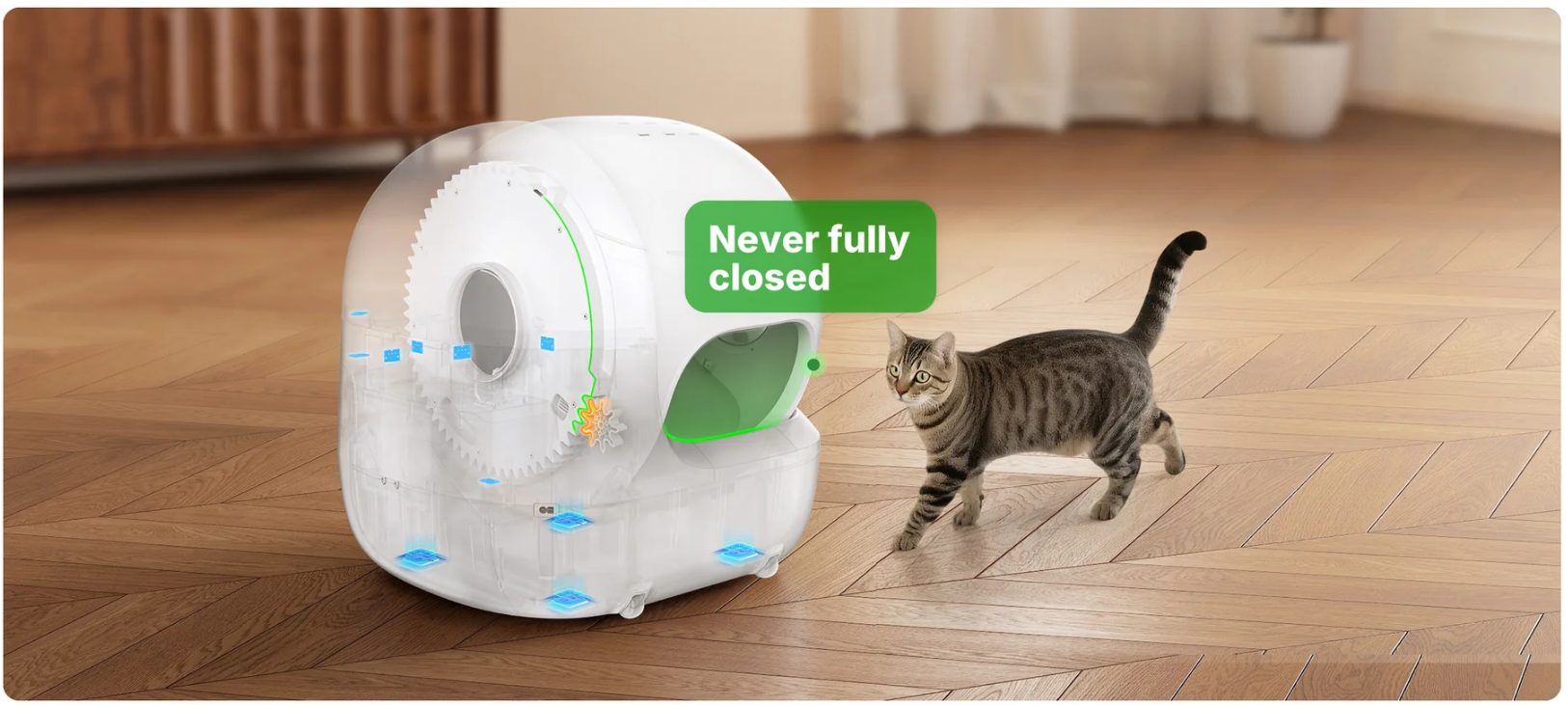 The patented anti-pinch design ensures the entrance is open at all times. 12 integrated safety sensors ensure maximum safety for cat's every litter box visit.