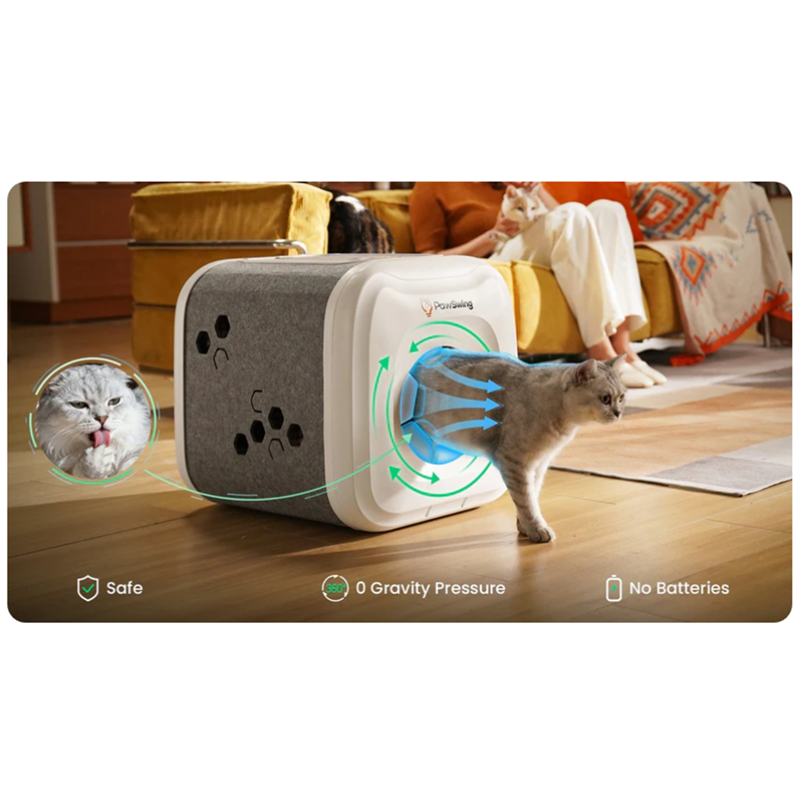 No electricity is required-PawSwing Neo runs entirely on your cat's natural movement. When your cat moves, it moves; when your cat stops, it stops instantly. There is absolutely no risk of pinching.