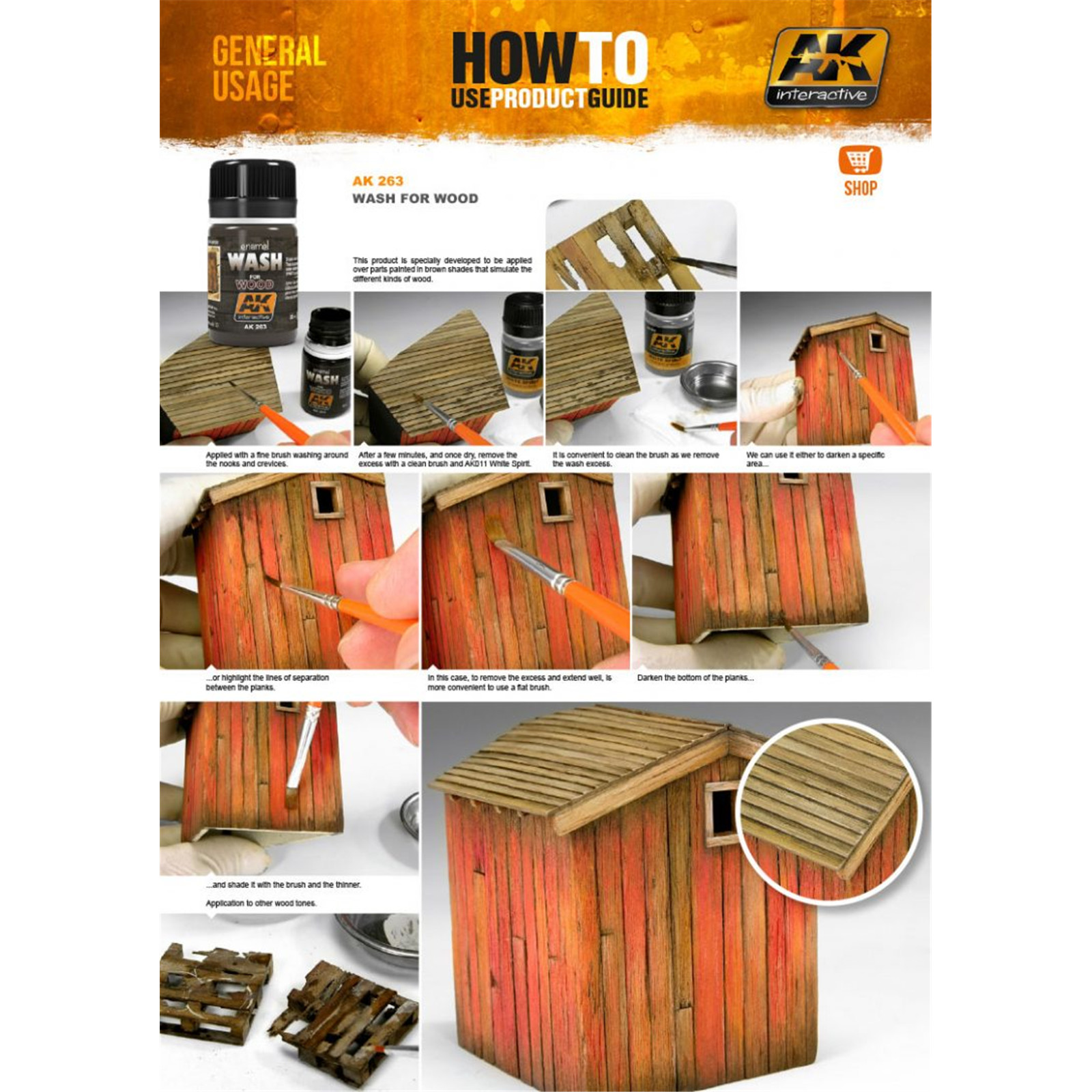 This product allow us bring life to the details of the wood accessories of our vehicles and complements. This wash is specially designed to be applied over the light colors of the wood, or even dark to create deep and enhance the wood. The basic technique used to weather any type of model is the wash, a classic technique that is still one of the most used techniques in modelling today. Apply the washes after shaking the bottle with a large brush to pick out details and creating shadows. The excess of the wash can be easily removed with a clean brush and White Spirit.