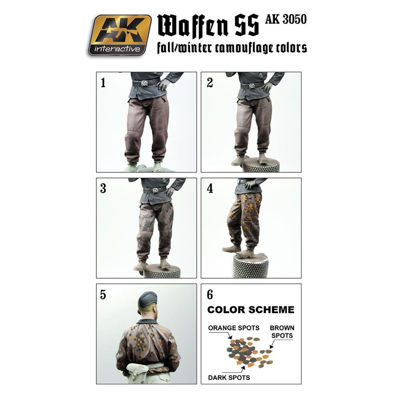 Belonging to our Figure Series line of high quality acrylic paints this set of six colors have been designed to offer optimal coverage when applied by brush. This set has been specially formulated by our art department for painting the autumn/winter variations of the uniforms used by the Waffen SS during WWII These colors are fully representative of this type of camouflage. These paints offer the perfect balance between fusion of colors, opacity and intensity. Your figures deserve to be treated like works of art; AK offers the widest range of specialty acrylic paints for uniforms and figures of any era. Our strict formula contains the highest quality pigments, and has been strictly tested under all conditions by the best modelers. Resistant to light, AK paints offer long lasting durability for your scale figures. Paints are matte, of extremely high quality, and their covering and drying abilities are designed to maximize your potential for figure painting. High quality results with little effort or complication.