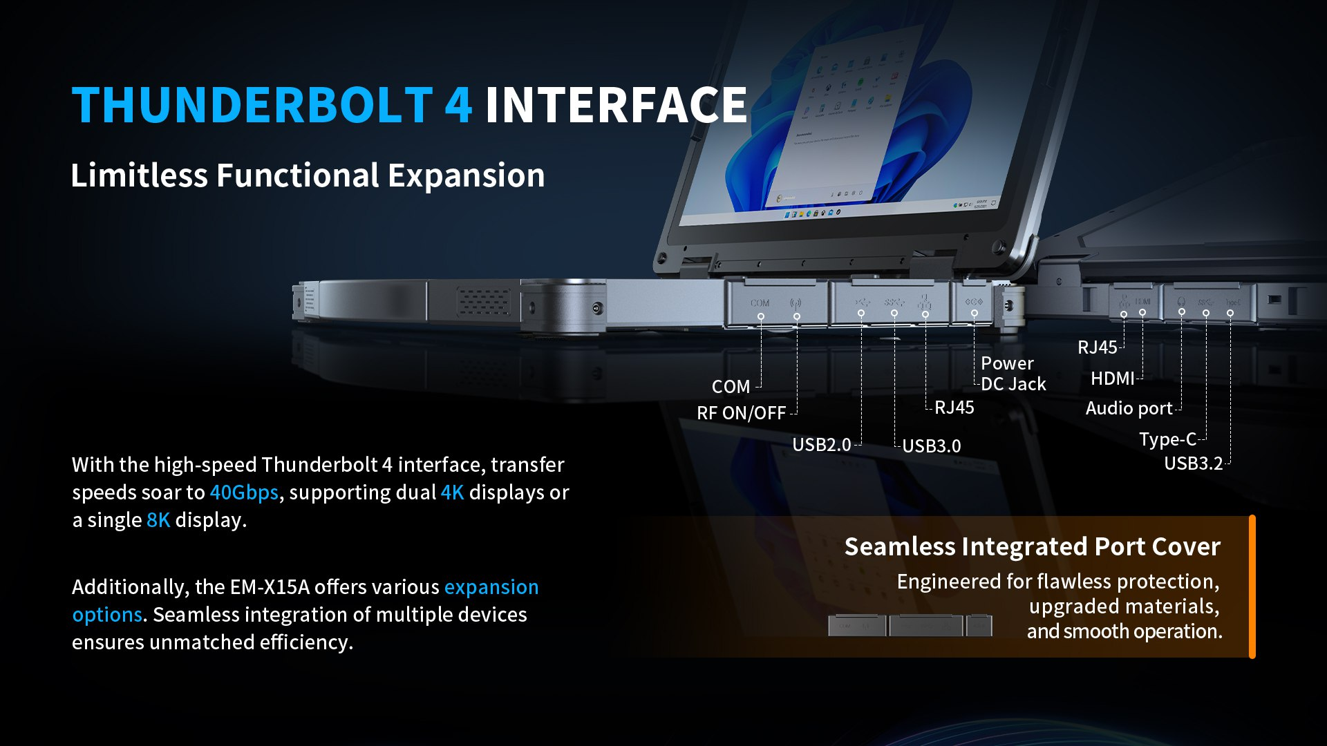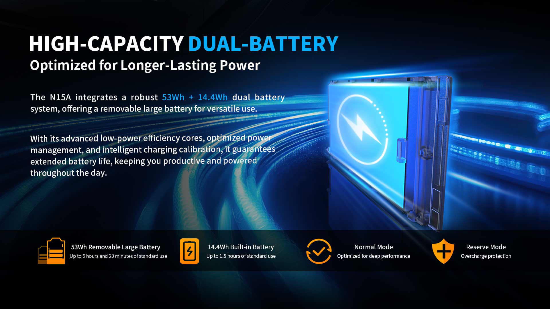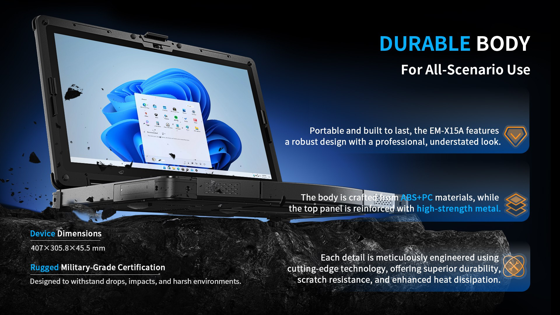 The N15A is powered by the 12th Gen Intel® Core™ i5/i7 processors and runs on the Windows 11/10 operating systems. It comes with a 15.6-inch high-resolution and high-brightness full lamination display, and a backlit keyboard for convenient interaction even in low-light conditions. It supports M.2 interface options for 5G/4G connectivity, along with WiFi 6 and BT5.1 for efficient data transfer. With a plethora of ports and docking station expansion capabilities, it is suitable for the needs of various industries. It features dual-battery endurance with a 56Wh + 14.4Wh setup, allowing hot-swapping of the larger battery. Boasting an IP65 ingress protection rating, it has also undergone rigorous testing in accordance with the MIL-STD-810H US military standard.