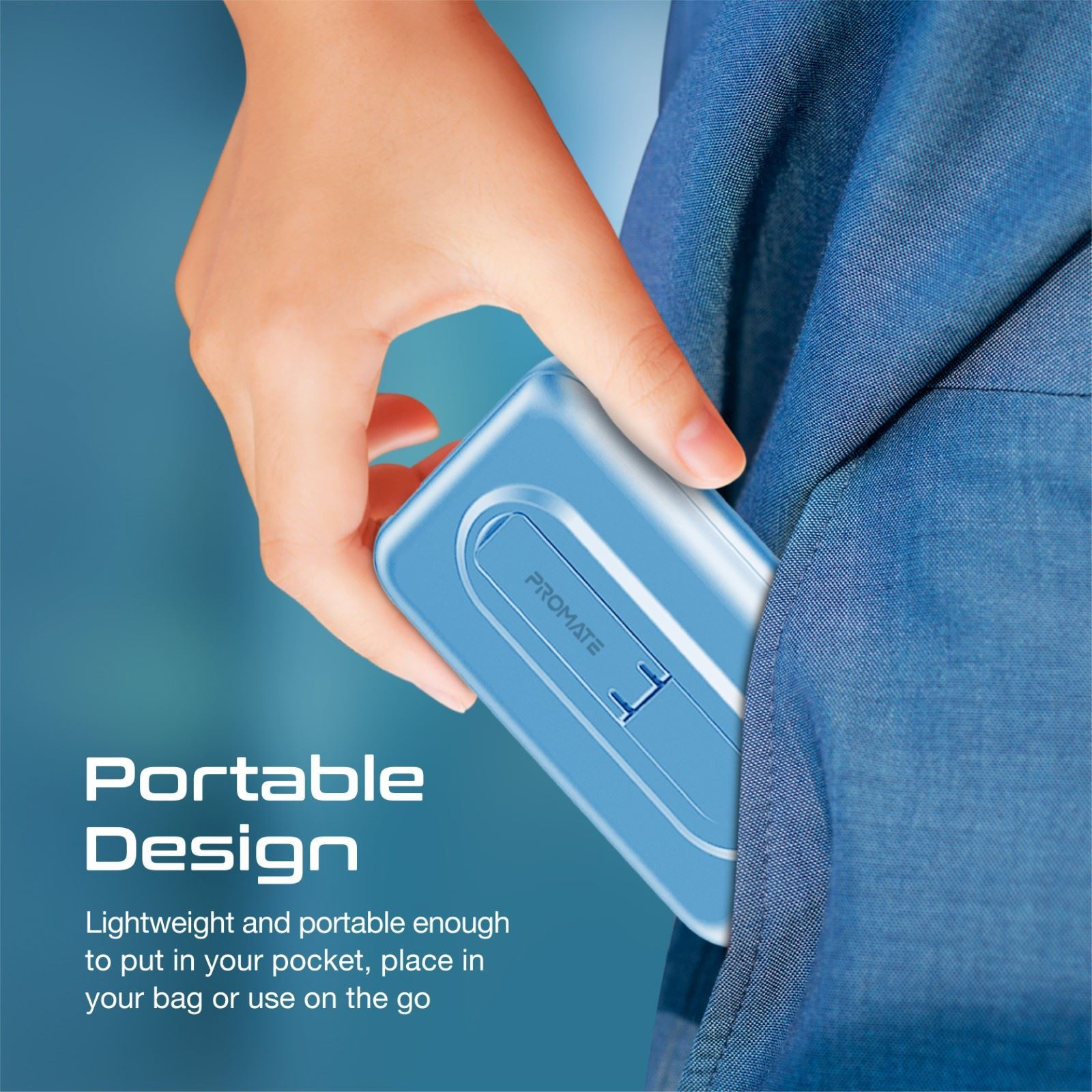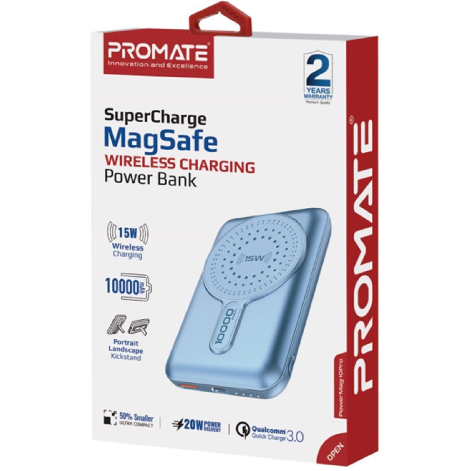 PROMATE 10000mAh Magnetic Qi 15W Wireless Charging Power Bank. USB-C Input, USB-C (20W PD) & USB-A Ports. MagSafe Case Compatible. Portrait/Landscape Kick Stand. Multi - Device Charging. Blue