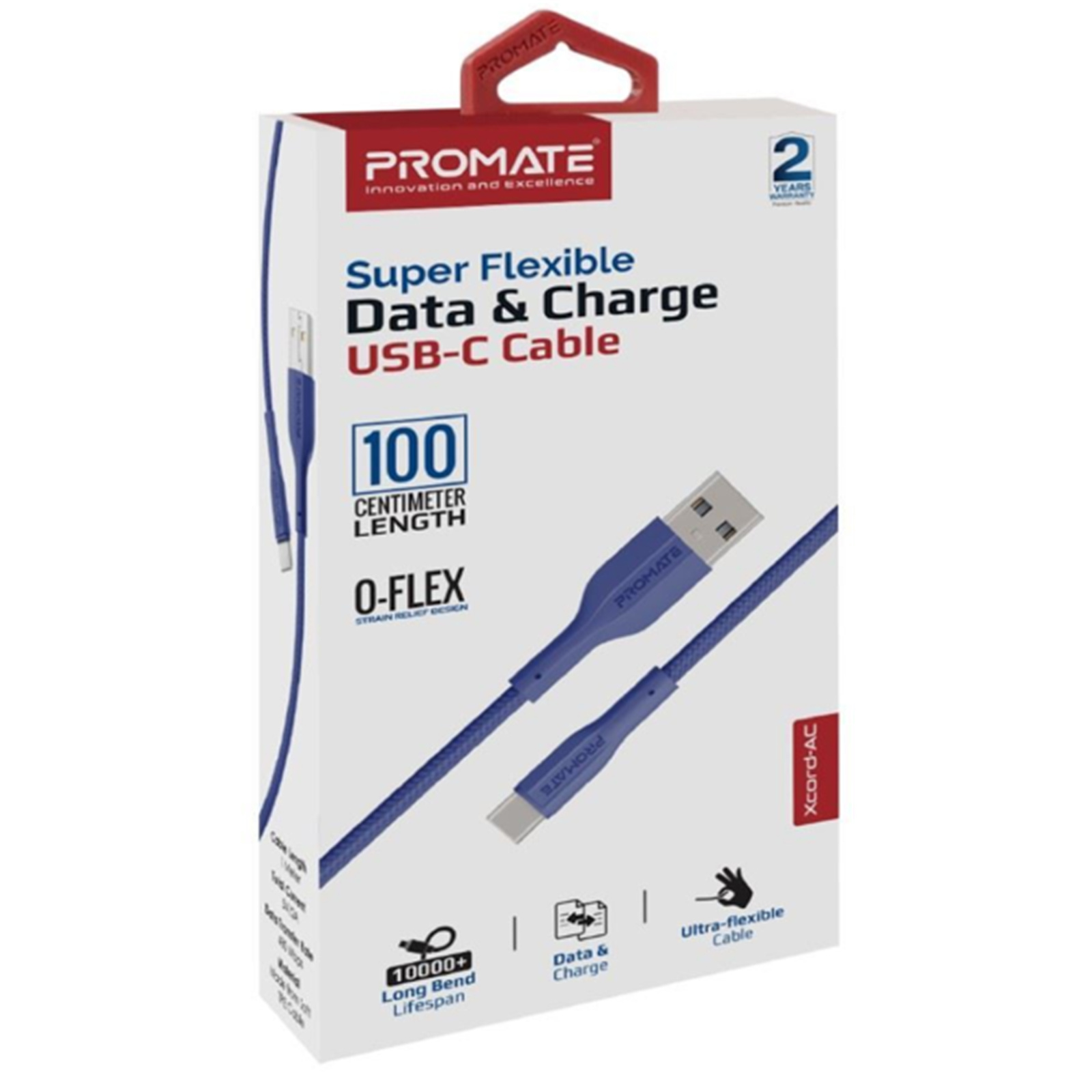 Promate XCORD-CC.BL 2A - 480Mbps USB-C Cable - 1m - Blue Super Flexible - Data & Charge