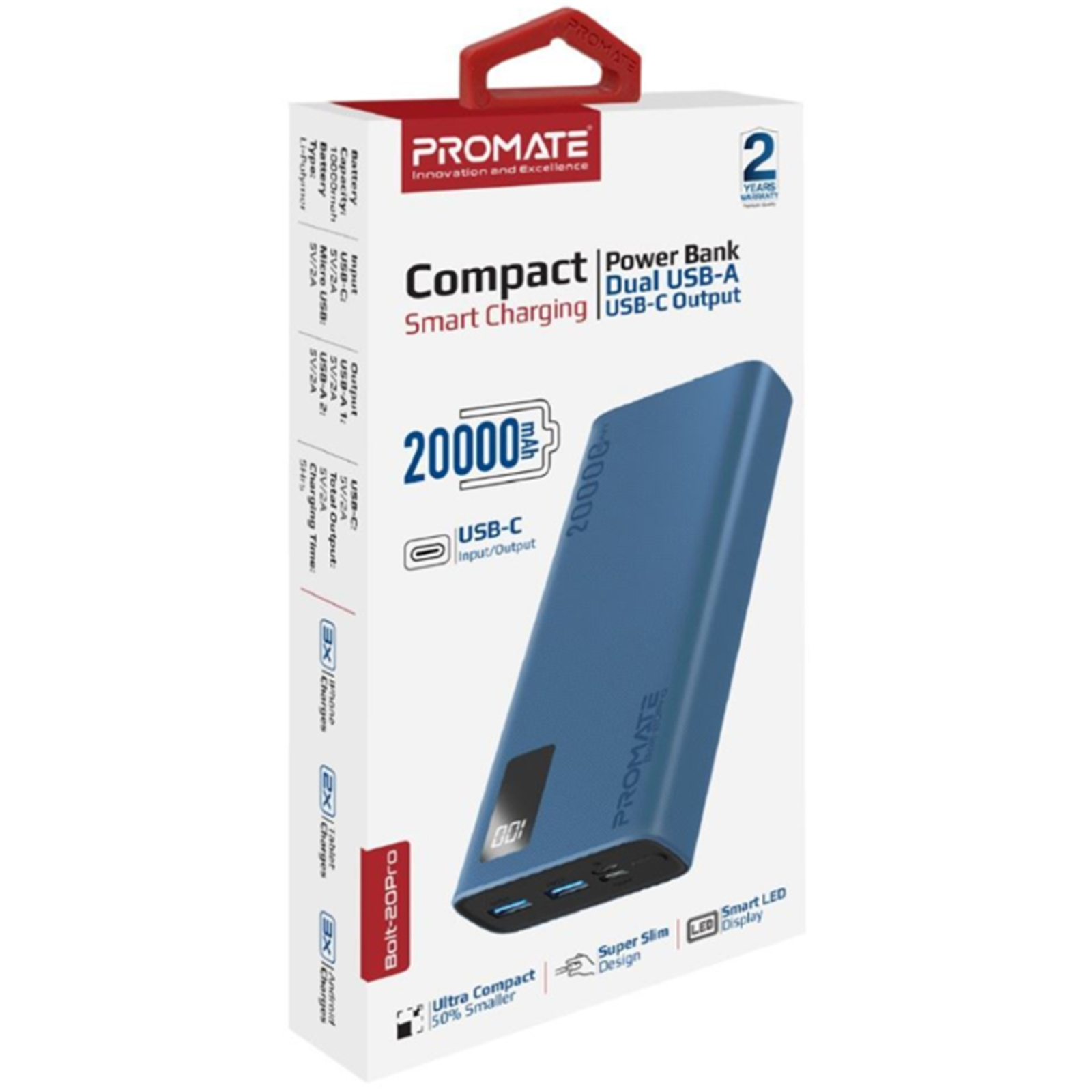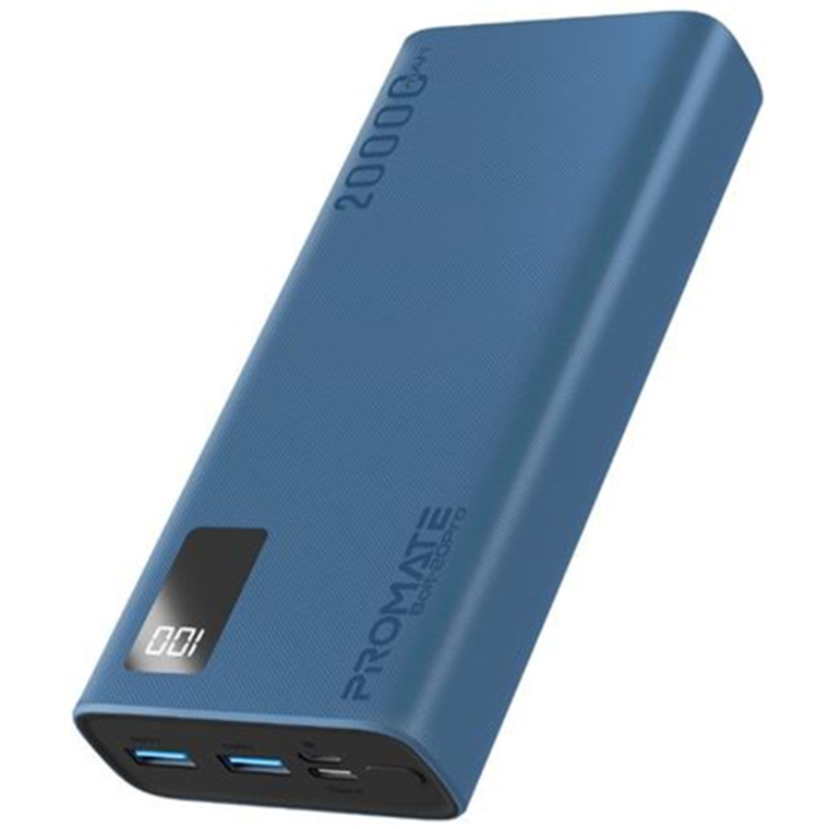 PROMATE 20000mAh Power Bank with Smart LED Display & Super Slim Design. Includes 2x USB-A & 1x USB-C Ports. 2A (Shared) Charging. Auto Voltage Regulation. Charge 3x Devices. Blue Colour.
