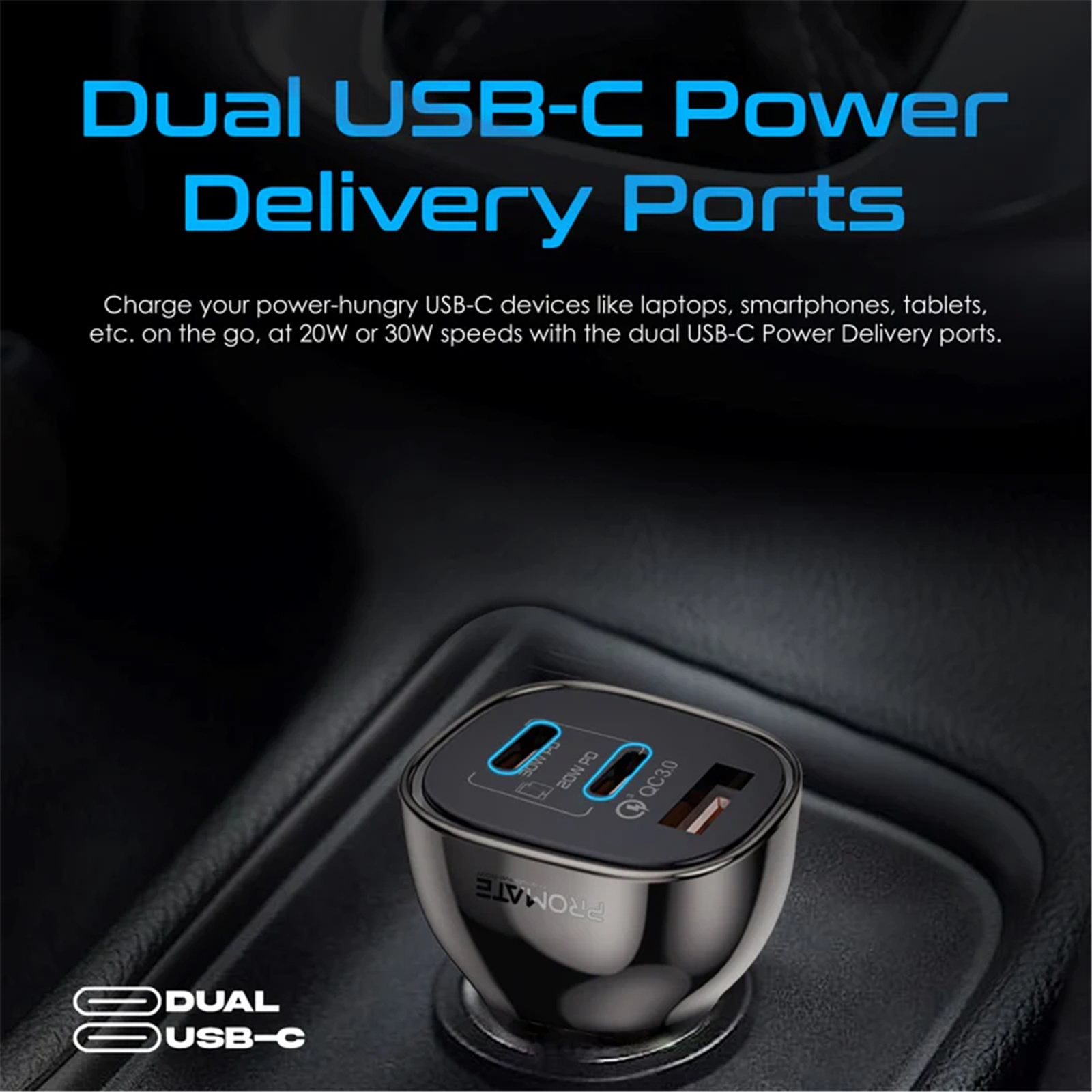 Product URL: https://www.pbtech.co.nz/product/PRM1175/Promate-TRANSDRIVE-80W-80W-Quick-Charging-In-Car-A