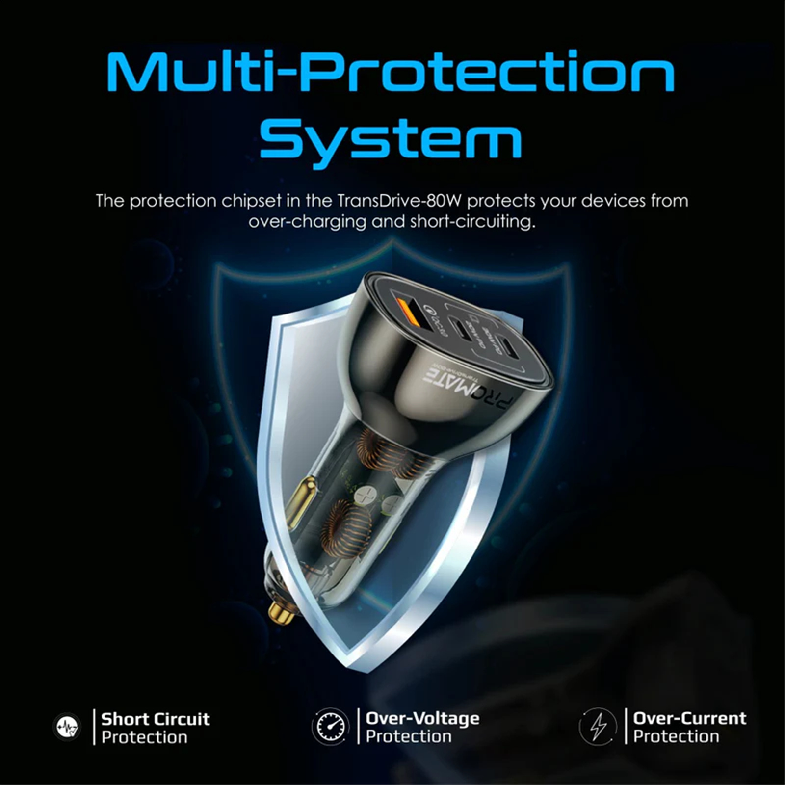 Promate TRANSDRIVE-80W 80W Quick Charging In-Car Adapter for Tablets & Smartphones
