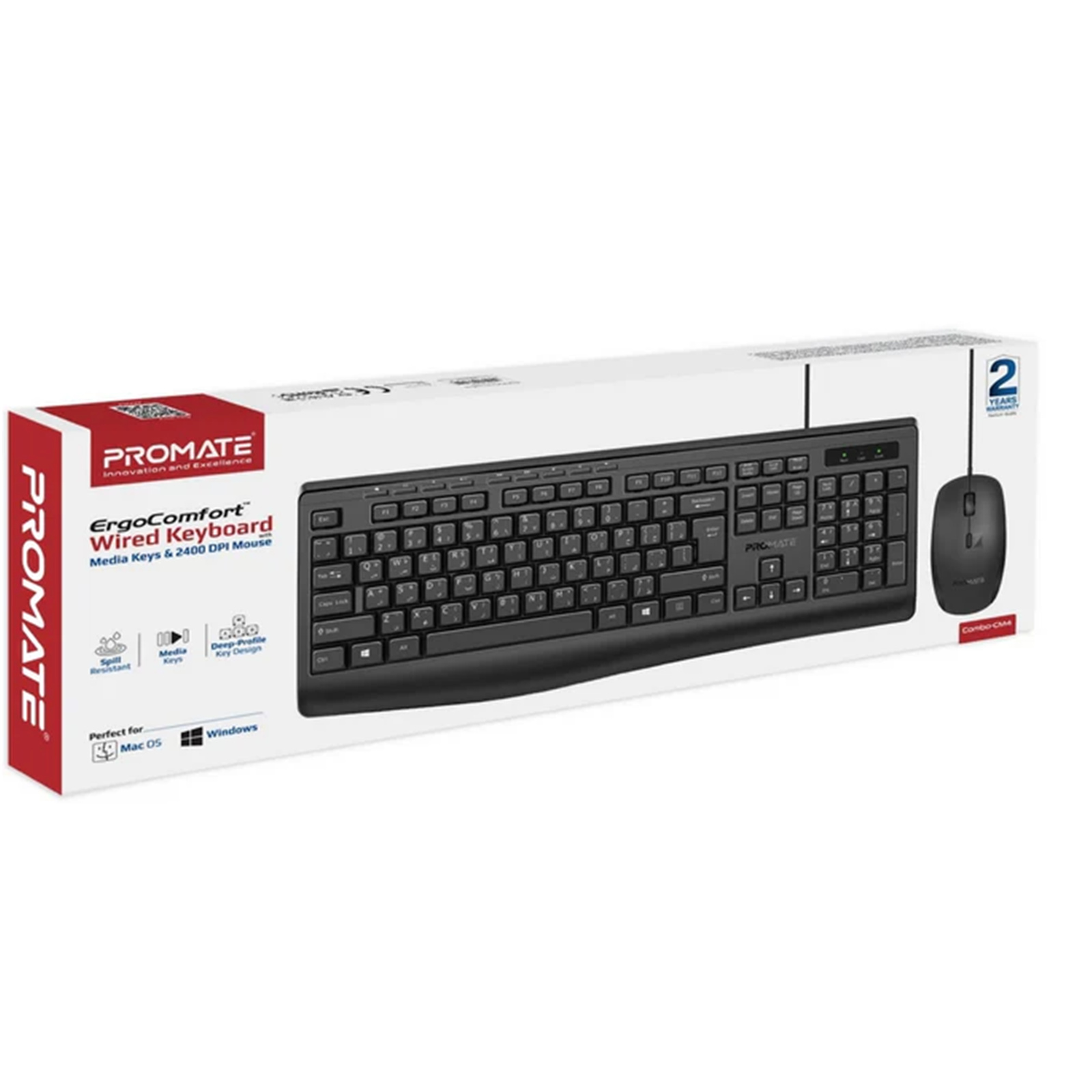 Promate Eronomic Wired Multimedia Keyboard & Mouse. 1.5m Cables, Quite Keys, Angled Kickstand,Spill Resistant Keyboard, 2400DPI Mouse, Anti-Slip Silicone Grip, Plug & Play.