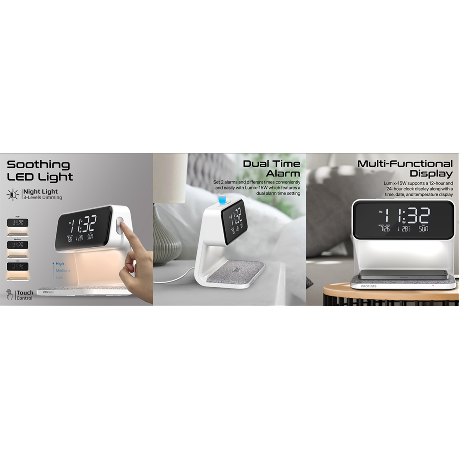 Promate LUMIX-15W 3-in-1 Multi-Function LED Alarm CLock with 15W Wireless Charger 10.7lm NightLight with3 Brightness Modes - Dual Alarm with Snooze Function - 12Hr/24Hr Time - Requires USB Wall Charger
