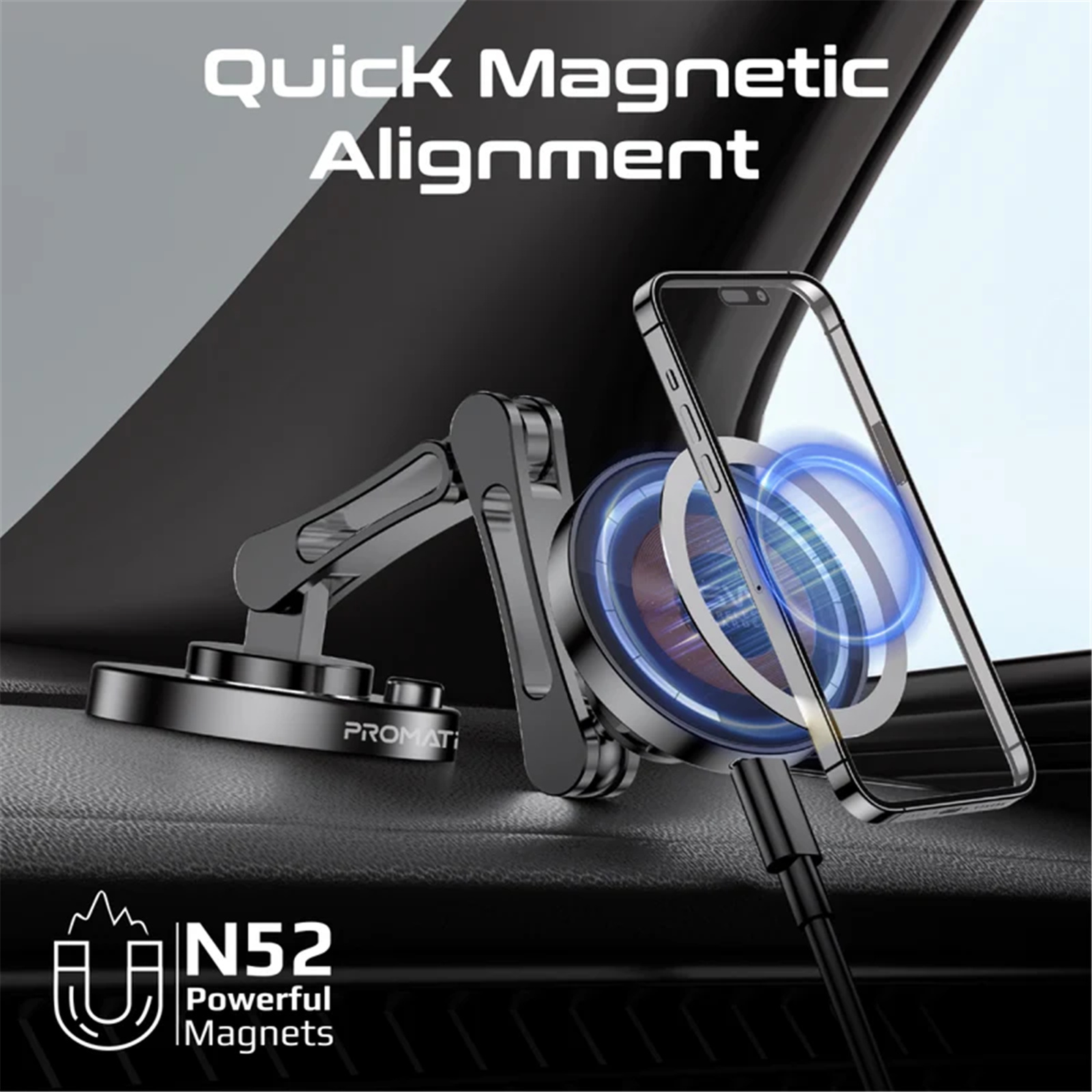 Promate MAGNUS-QI SecureGrip 360 Cradleless 15W Qi Magnetic Wireless in-Car Phone Charger &Holder.Designed for Dashboard & Windshield. Height Adjustable. Ultra Slim.