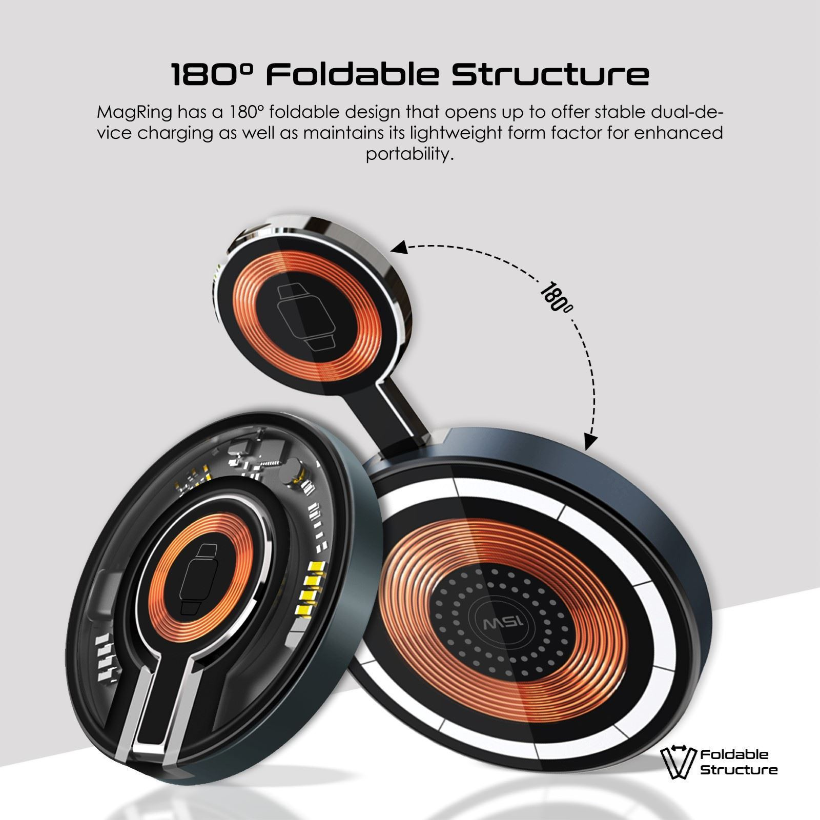 MagRing has a 180° foldable design that opens up to offer stable dual-device charging as well as maintains its lightweight form factor for enhanced portability.