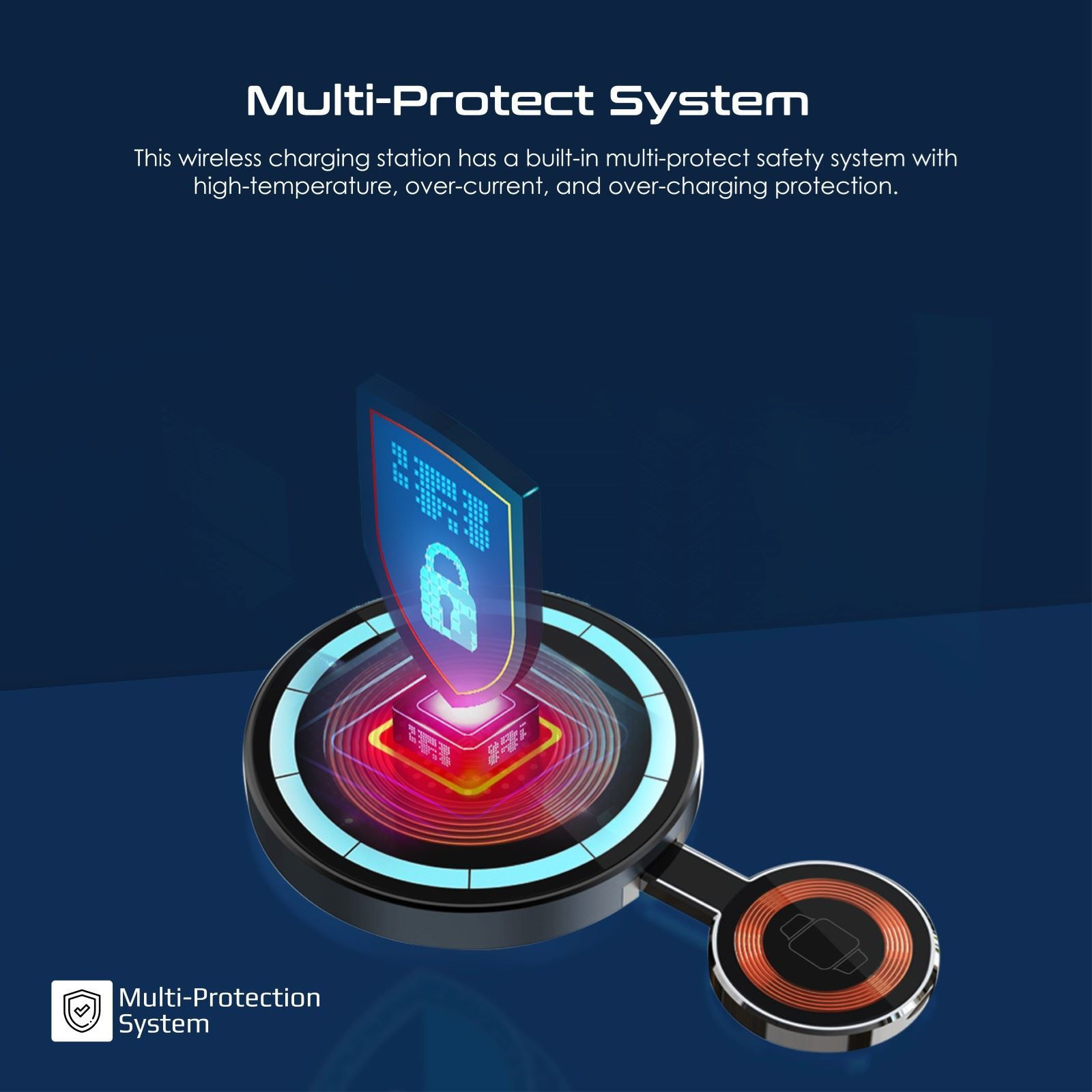 This wireless charging station has a built-in multi-protect safety system with high-temperature, over-current, and over-charging protection.
