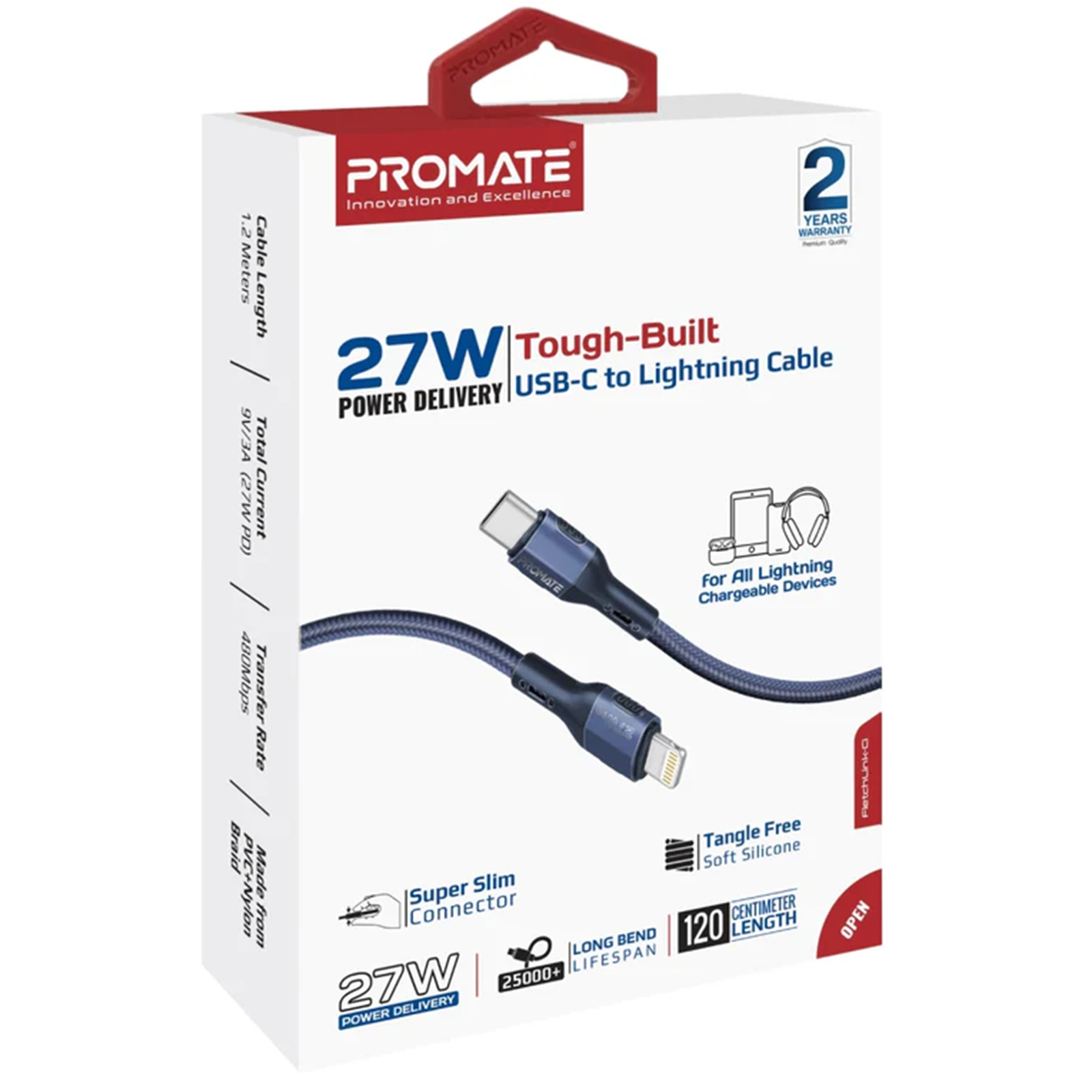 Promate FLETCHLINK-CI.BL Tough Built - 27W PD - 480Mbps USB-C to Lightning Cable - 1.2m - Blue